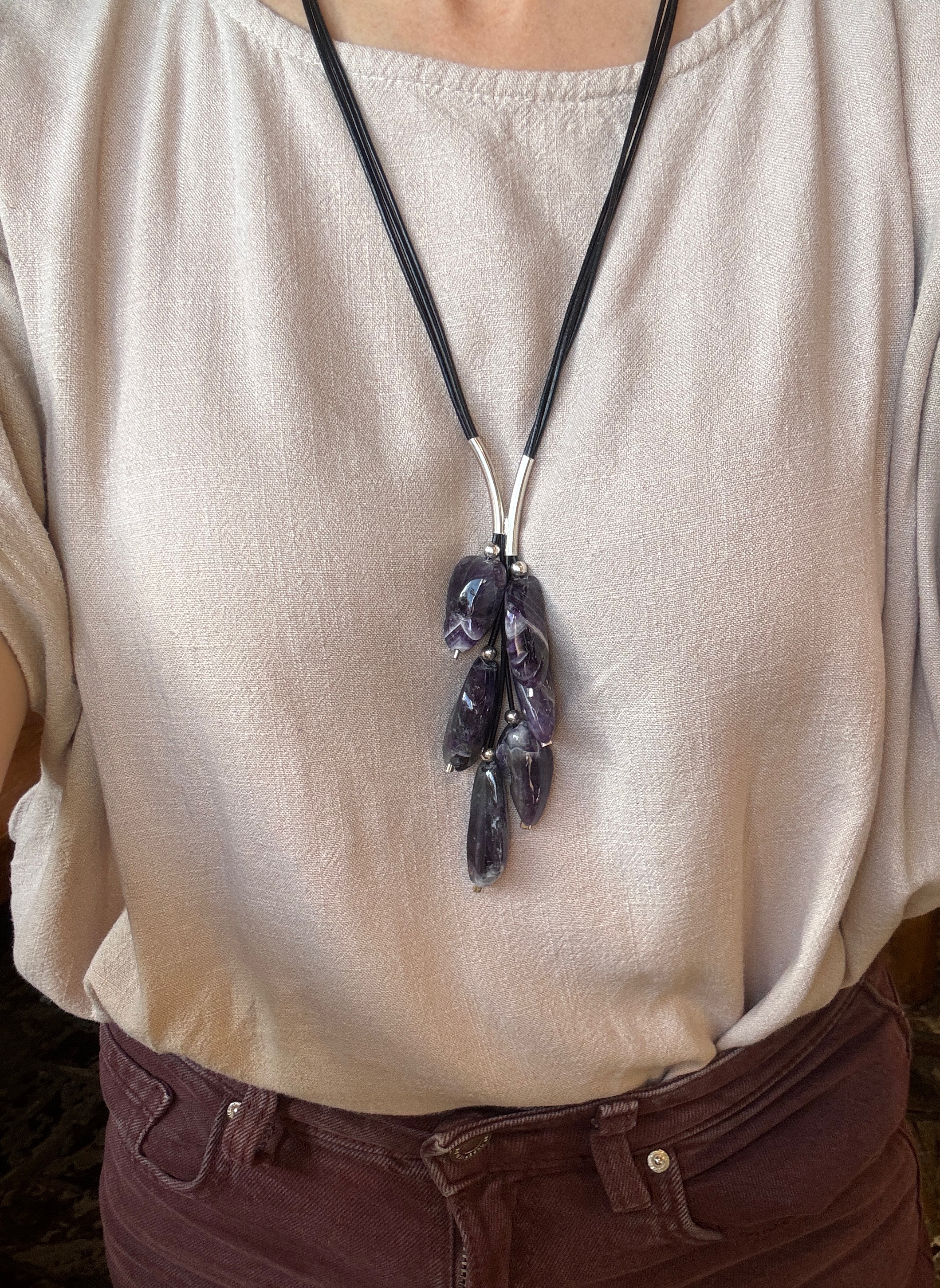 Naszyjnik Grono wykonany z pięknych ametystów w kształcie bryłek. Całości dopełnia srebro pr.925 oraz rzemień w czarnym odcieniu.