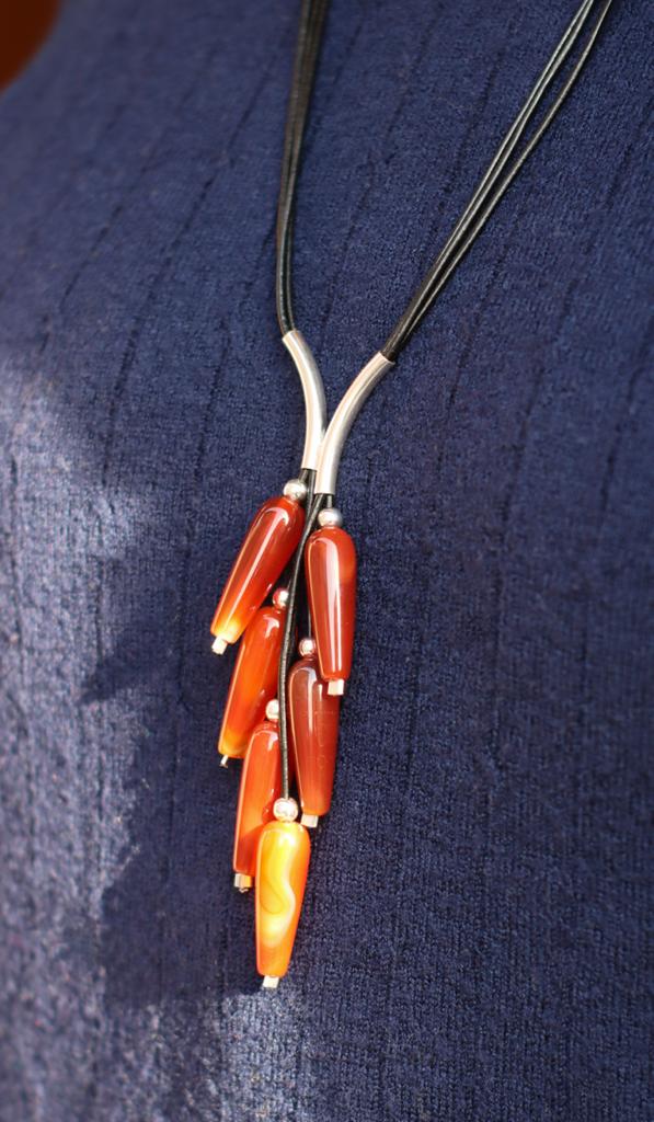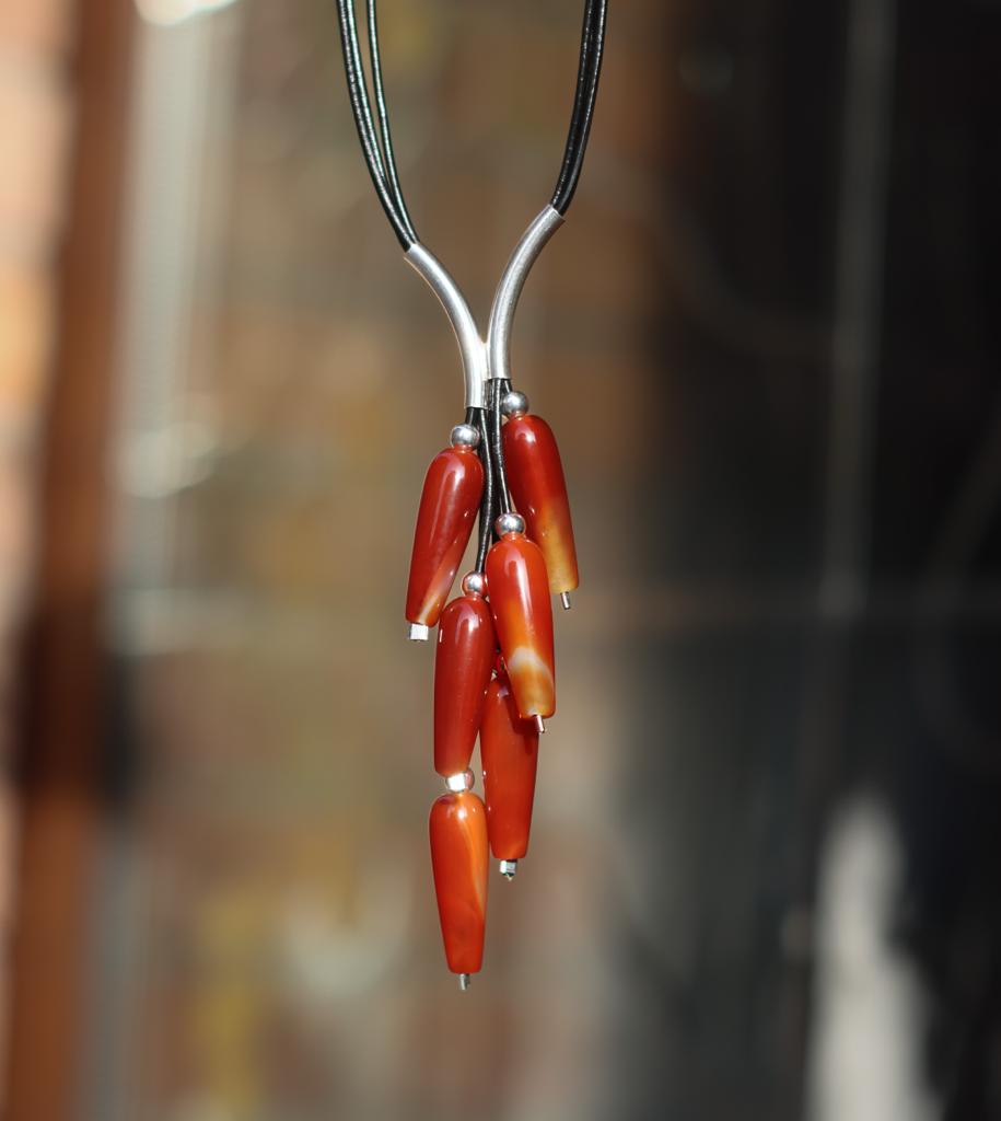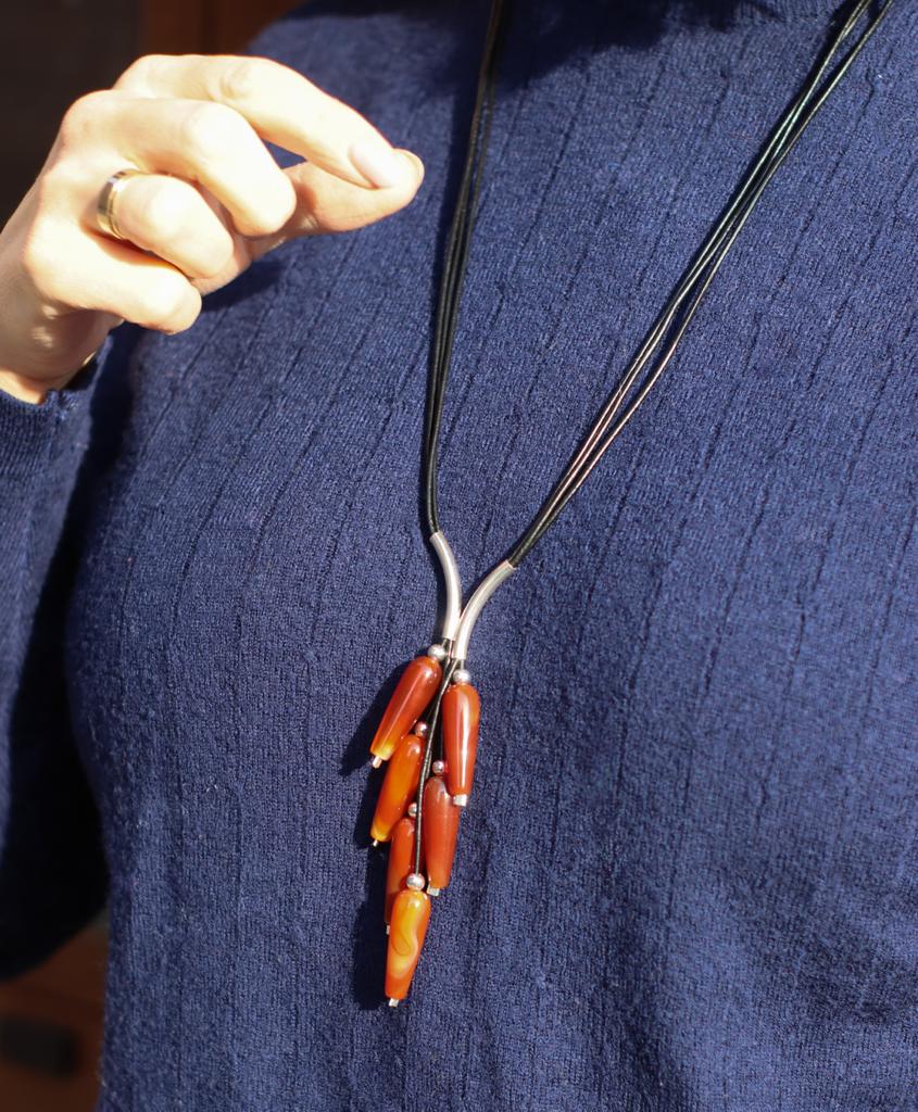 Naszyjnik Grono wykonany z karneoli, srebra pr.925 oraz rzemienia w czarnym kolorze.
