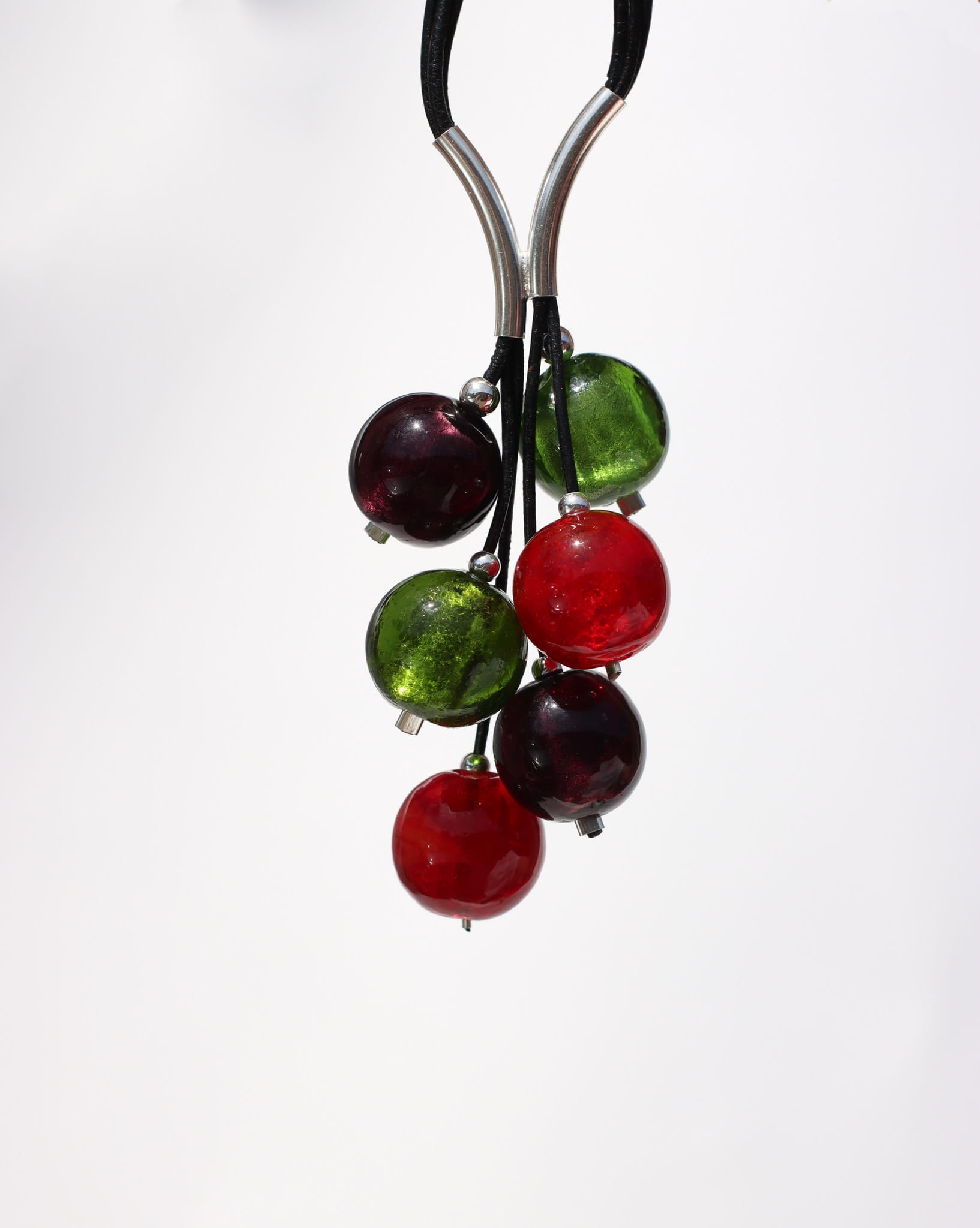 Naszyjnik Grono wykonany z kolorowego szkła weneckiego, srebra pr.925 oraz rzemienia w czarnym kolorze.