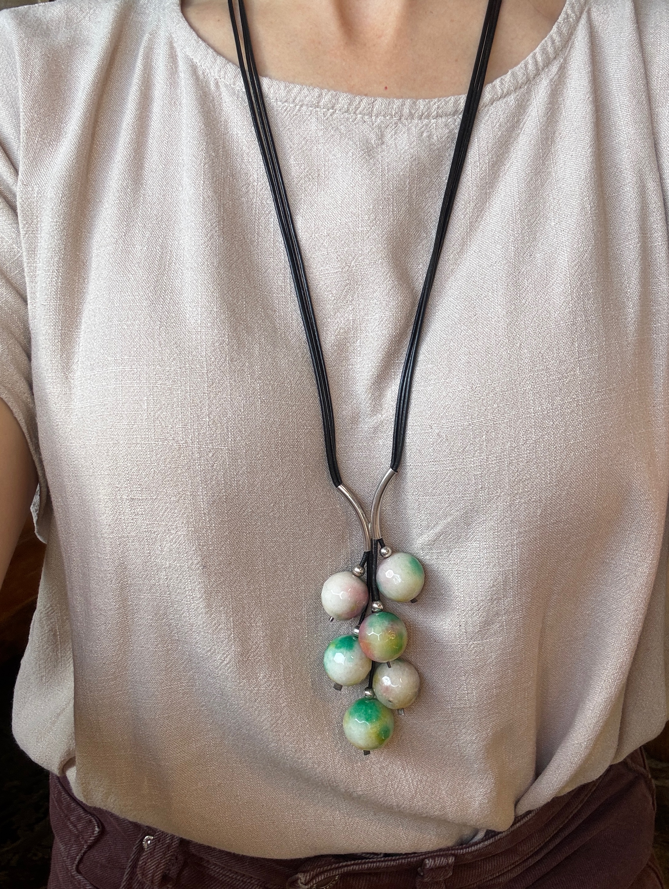 Naszyjnik Grono wykonany ręcznie przez Magdę z kolorowych jadeitów w kształcie fasetowanych kulek srebra pr.925 oraz rzemienia w grafitowym kolorze.