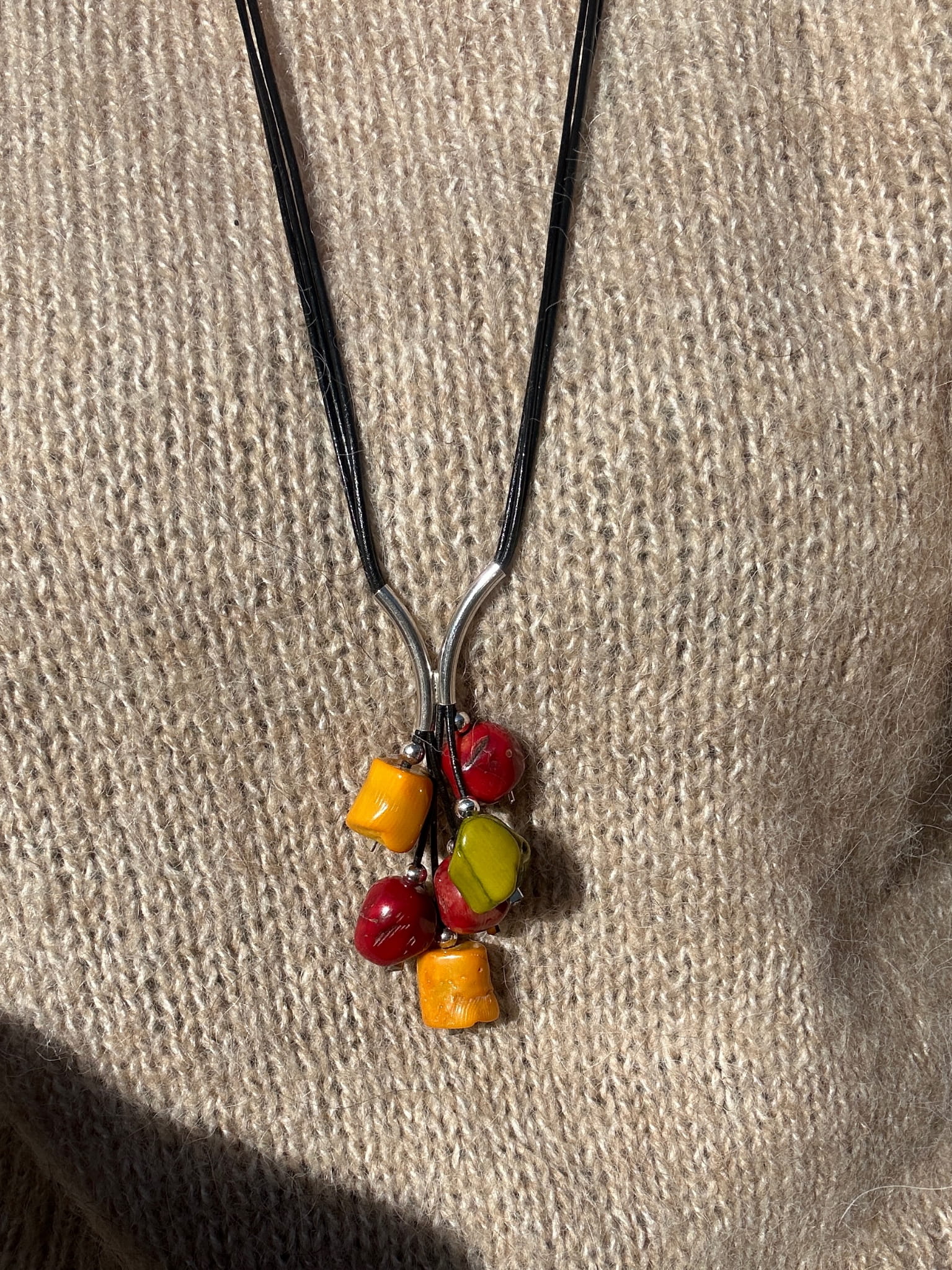 Naszyjnik Grono z korala w kolorze czerwonym, zielonym i żółtym, srebra pr.925 oraz czarnego rzemienia.