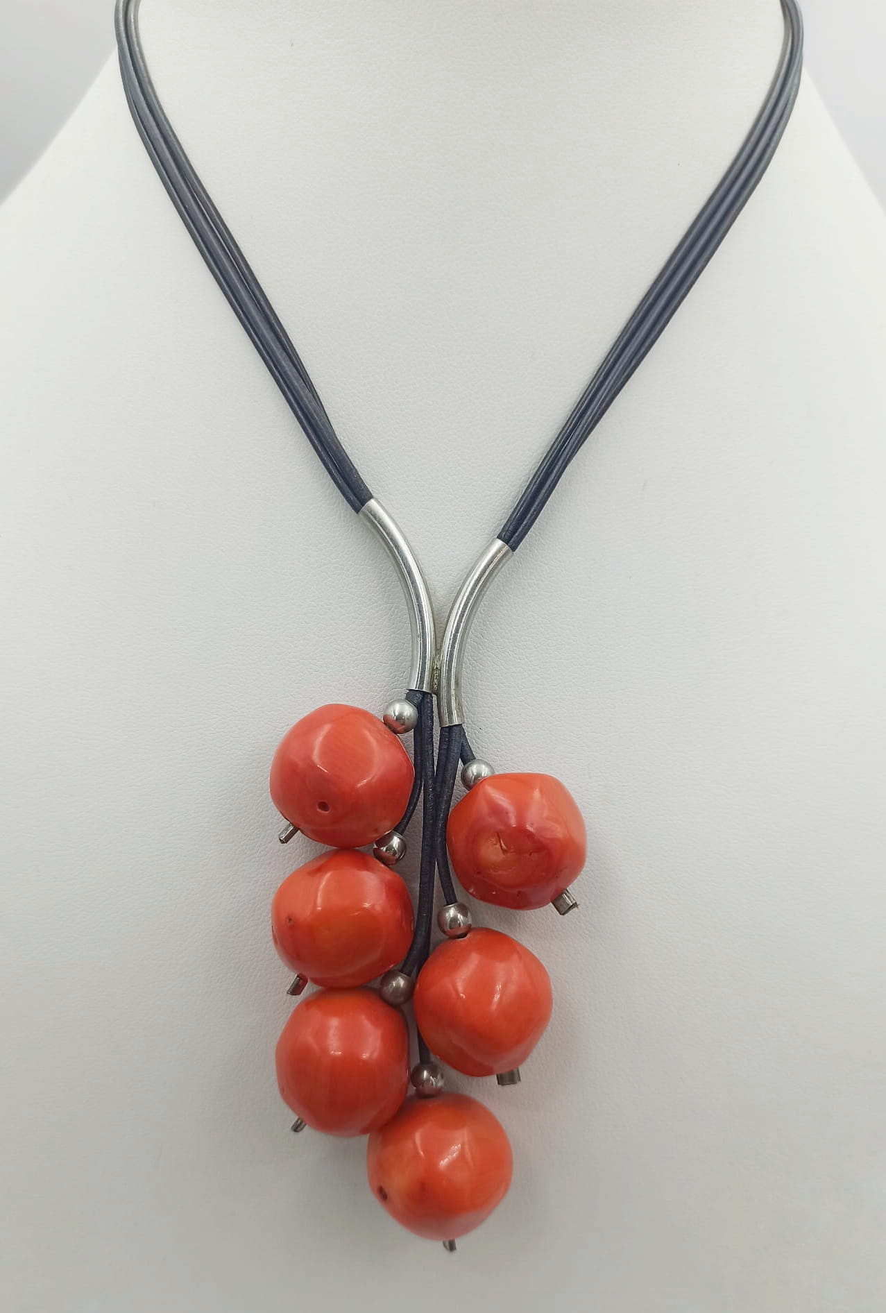 Długi naszyjnik Grono wykonany z pomarańczowego korala w kształcie bryłek, srebra pr.925 oraz rzemienia w czarnym kolorze.