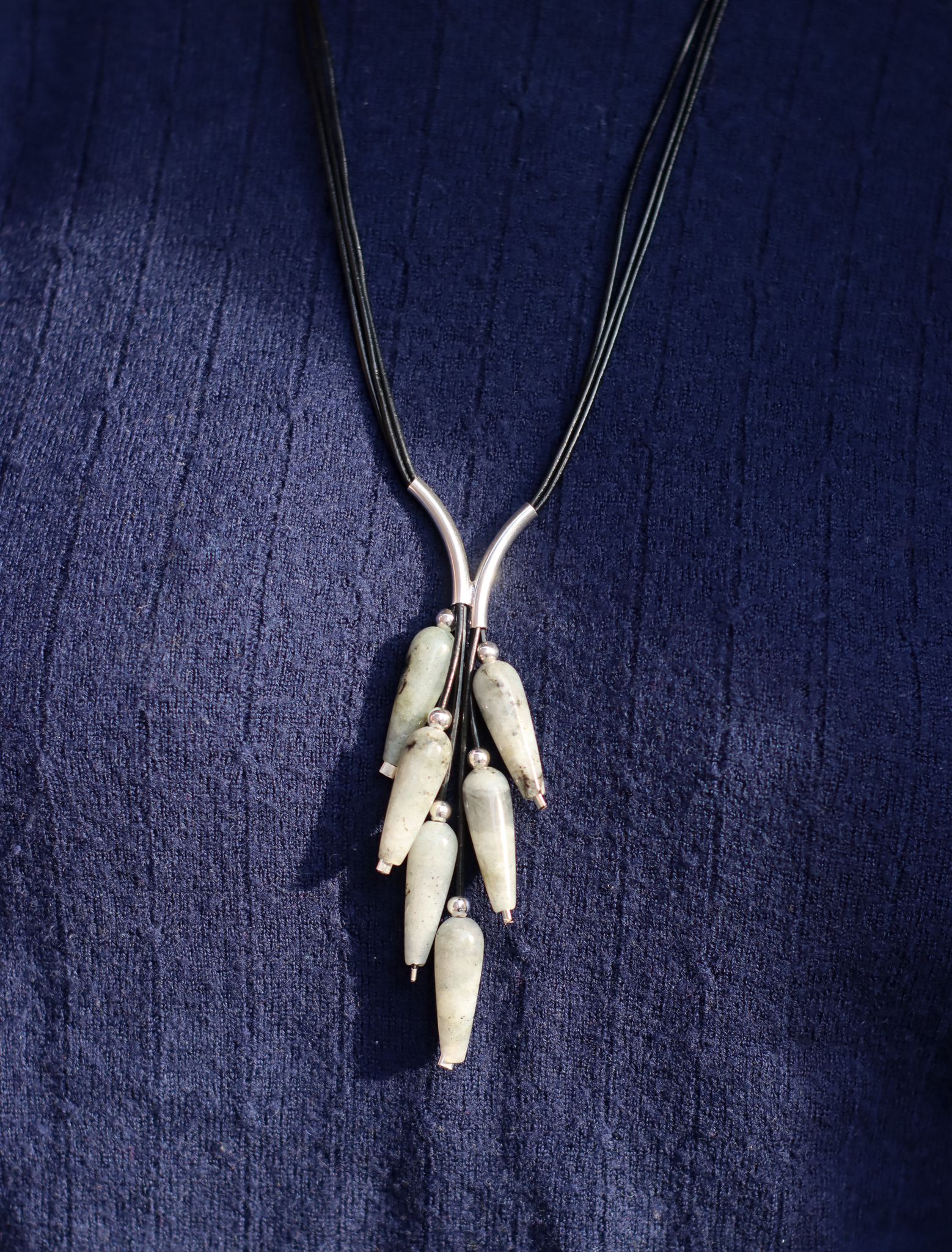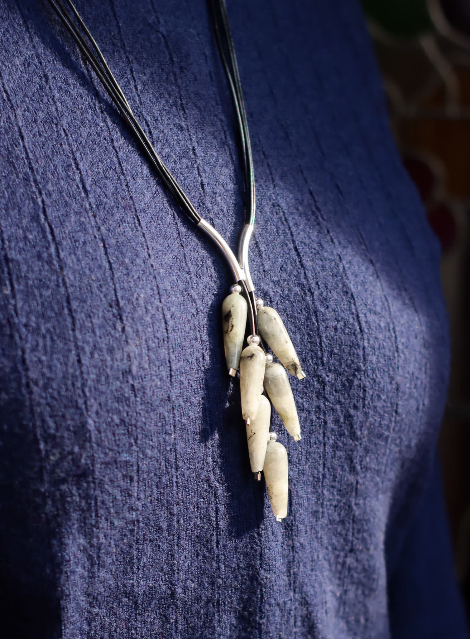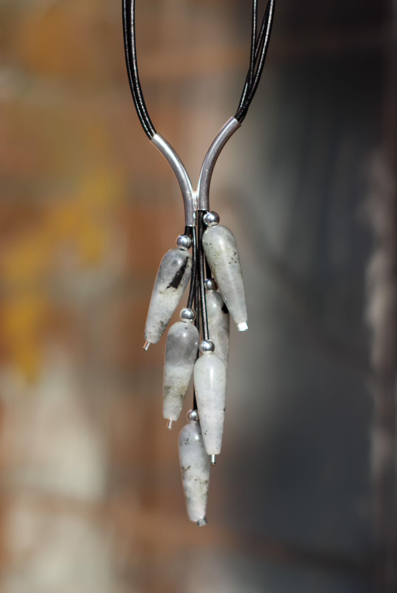 Naszyjnik Grono wykonany z podłużnego labradorytu, srebra pr.925 oraz rzemienia w kolorze czarnym