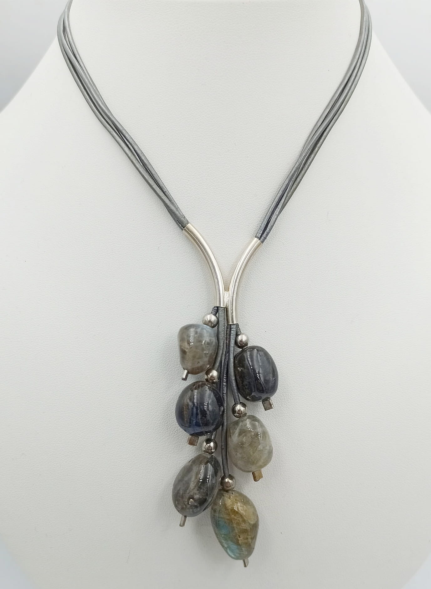 Naszyjnik Grono wykonany z pięknego labradorytu w kształcie bryłek, srebra pr.925 oraz rzemienia w grafitowym odcieniu.