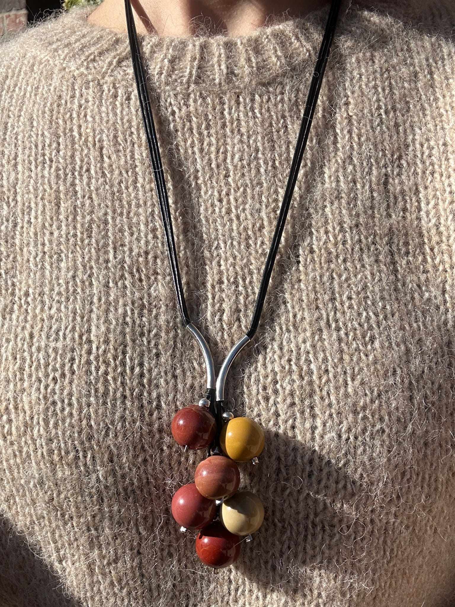 Naszyjnik Grono wykonany z mokaitów czyli odmiany jaspisu, srebra pr.925 oraz rzemienia w czarnym kolorze.