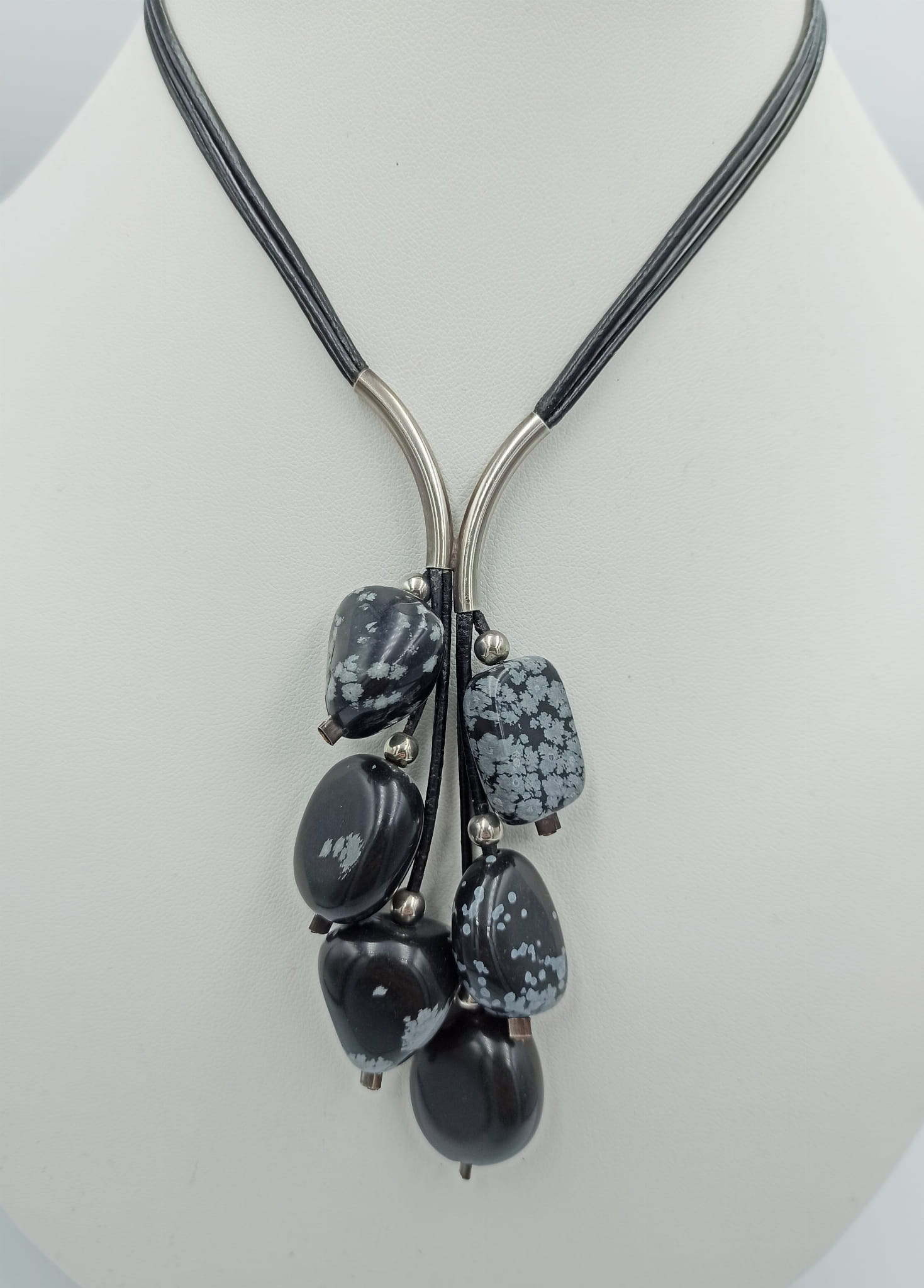 Naszyjnik Grono wykonany z obsydianu śnieżnego, srebra pr.925 oraz rzemienia w czarnym kolorze.