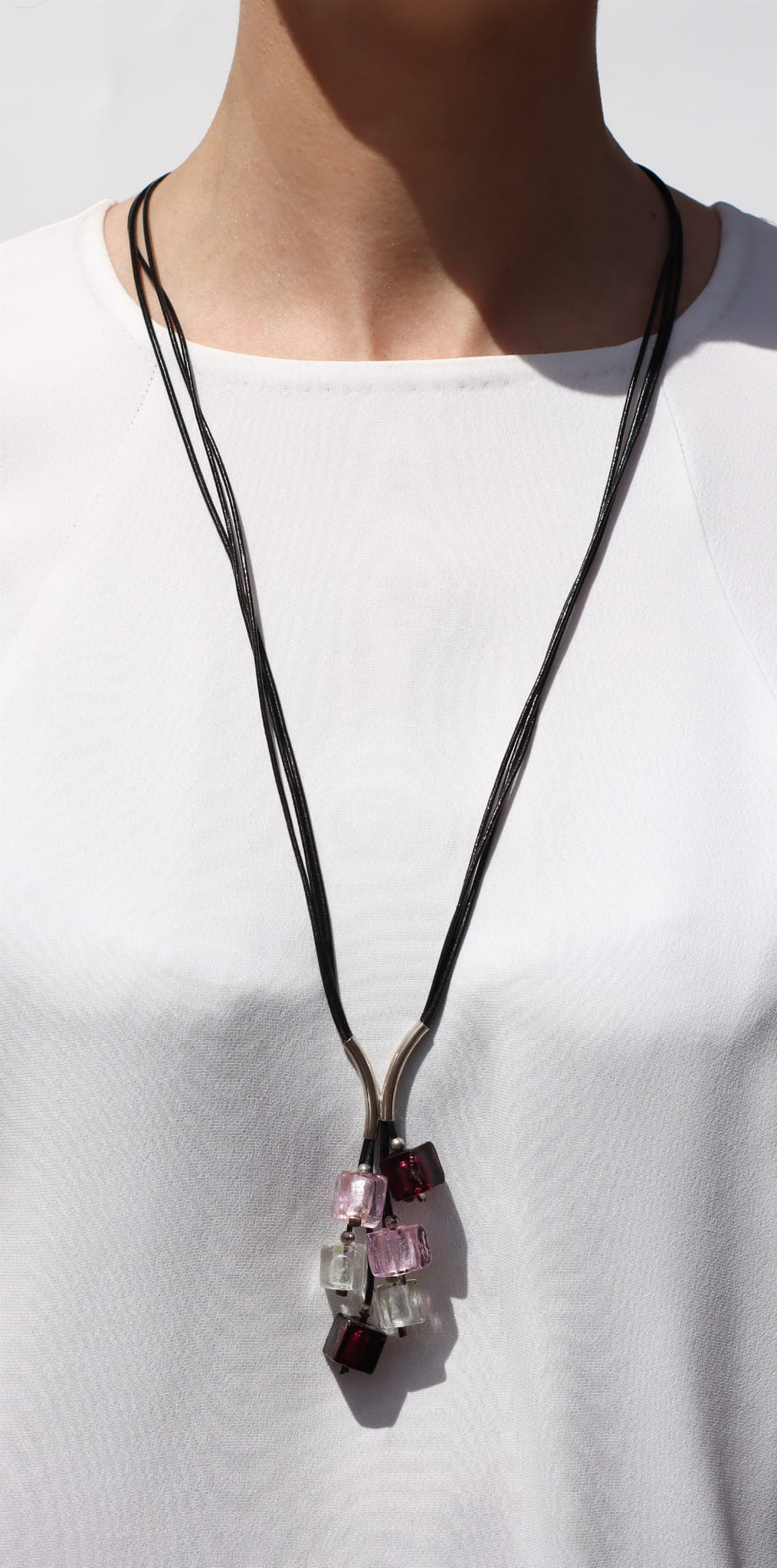 Naszyjnik Grono wykonany z Kostek fioletowego, różowego i białego szkła weneckiego, srebra pr.925 i rzemienia w czarnym kolorze.