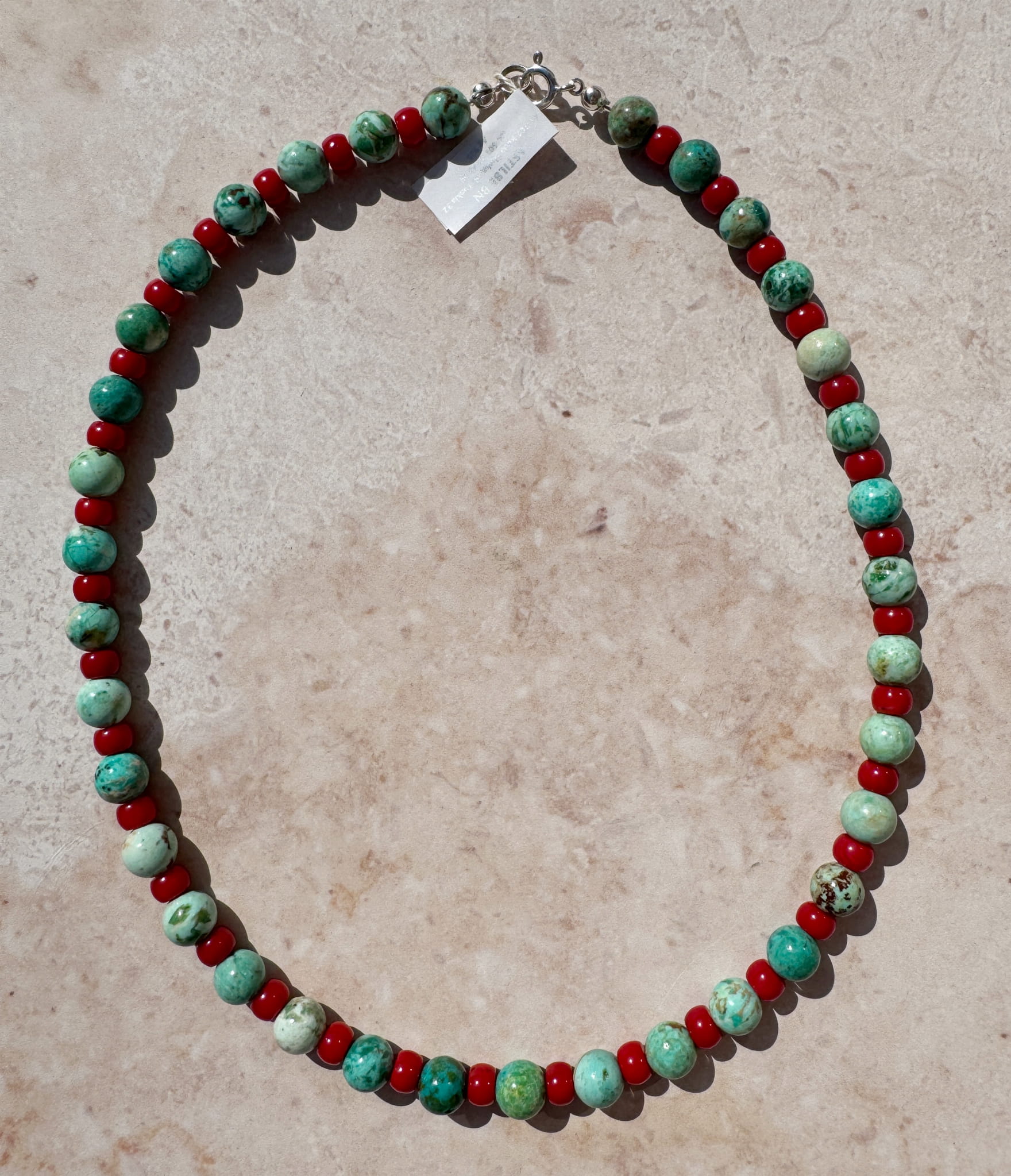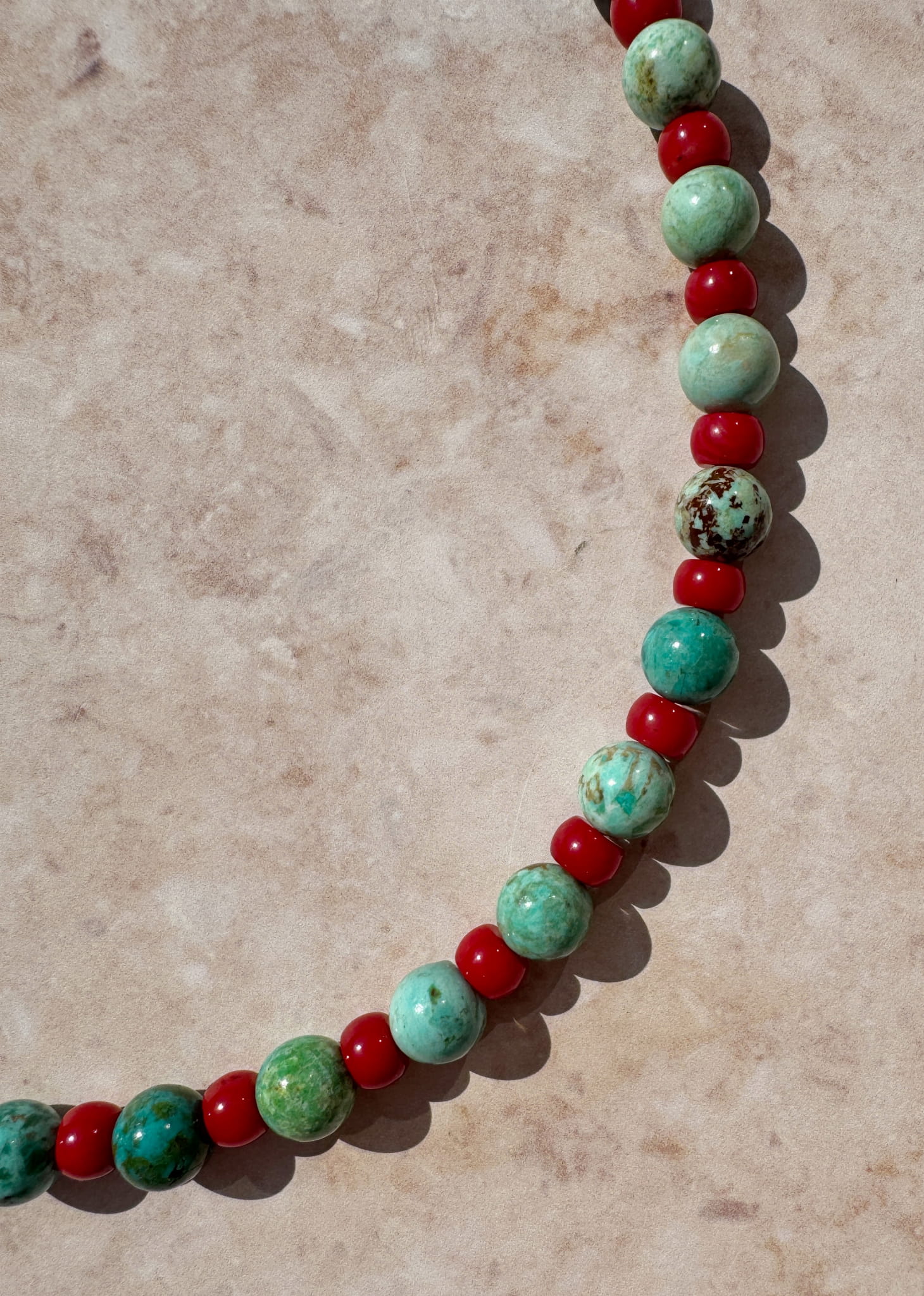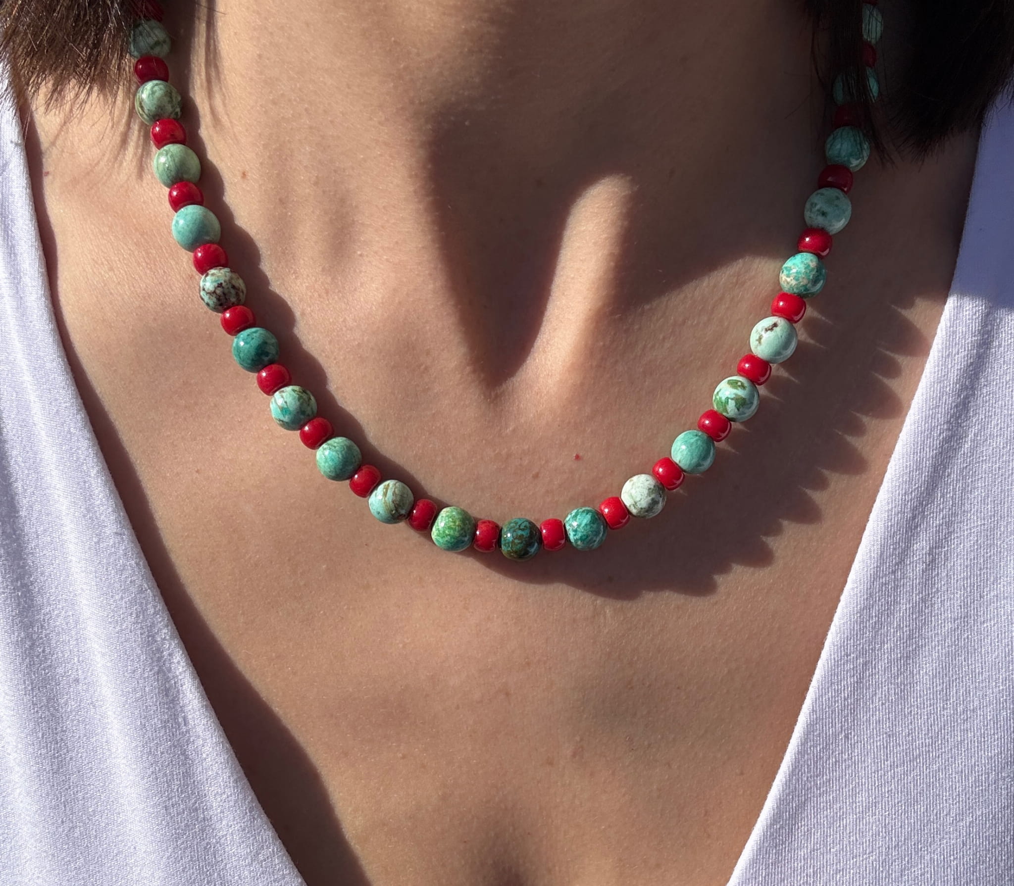 Piękny, ręcznie wykonany naszyjnik z czerwonego korala i pastelowych turkusów z zapięciem ze srebra pr. 925