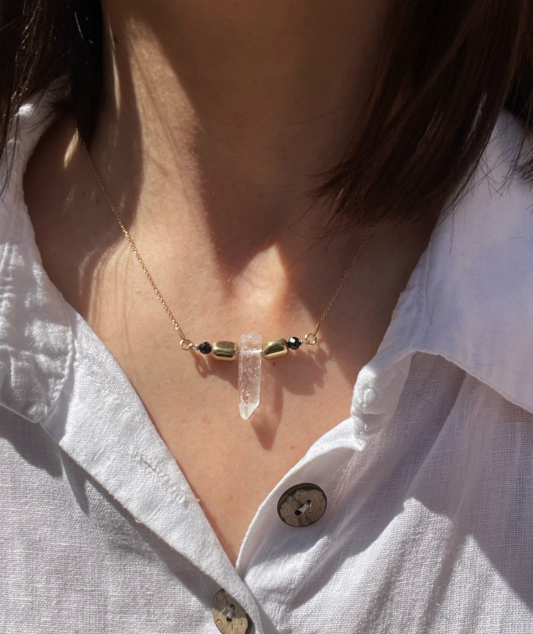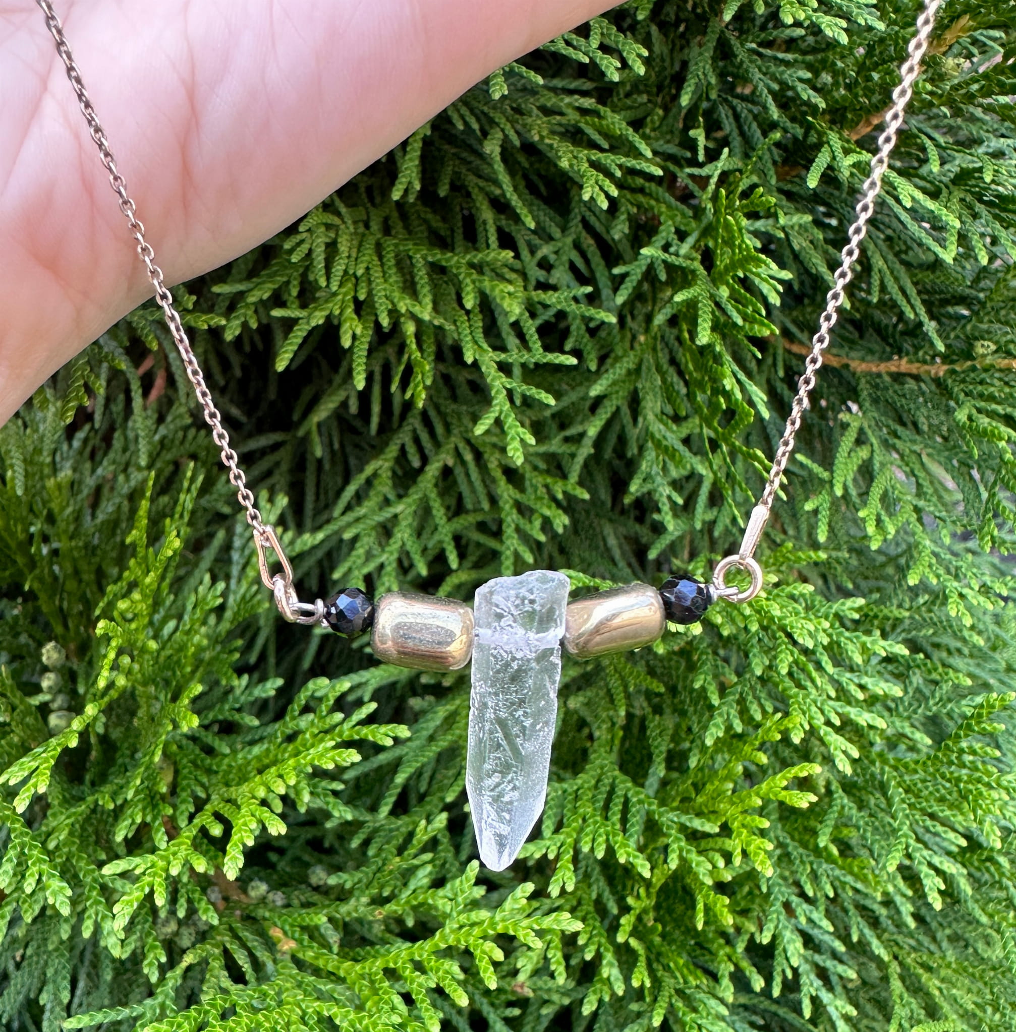 Delikatny naszyjnik z soplem surowego kryształu górskiego, złotym hematytem, czarnym fasetowanym turmalinem na łańcuszku ze srebra pozłacanego pr.925