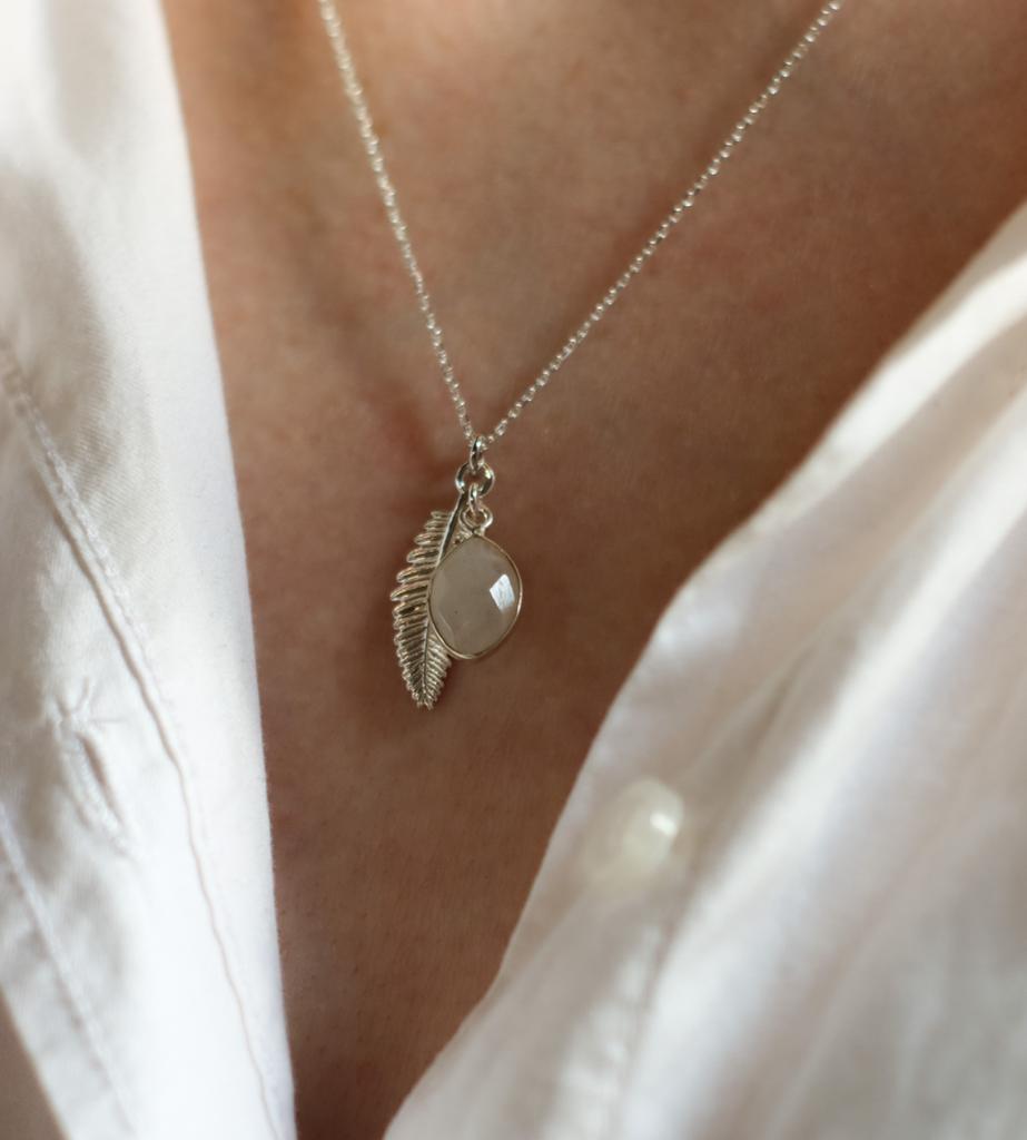 Naszyjnik Liść Paproci z białym kamieniem księżycowym na łańcuszku ze srebra pr. 925