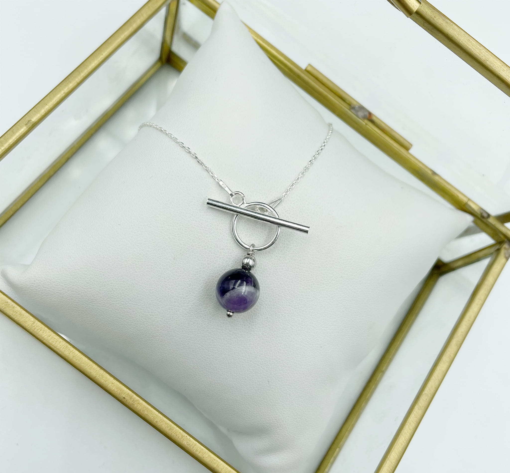 Ręcznie wykonany delikatny łańcuszek z klasycznego srebra pr.925 z zawieszką z kuleczki fioletowego ametystu.