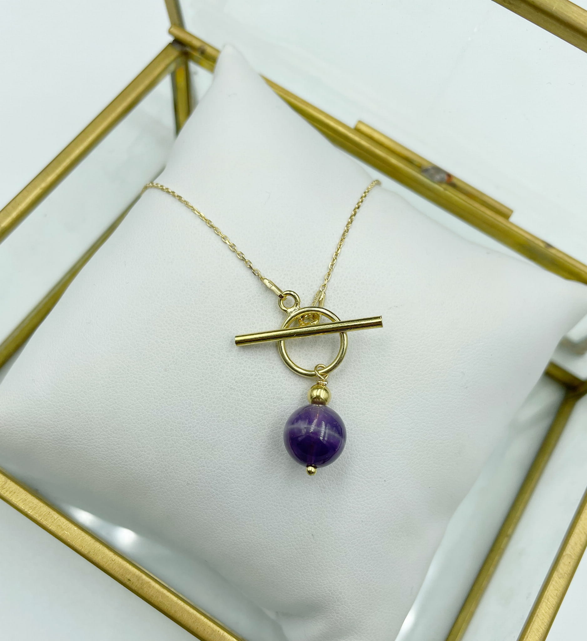 Ręcznie wykonany delikatny łańcuszek z pozłacanego srebra pr.925 z zawieszką z kuleczki fioletowego ametystu.