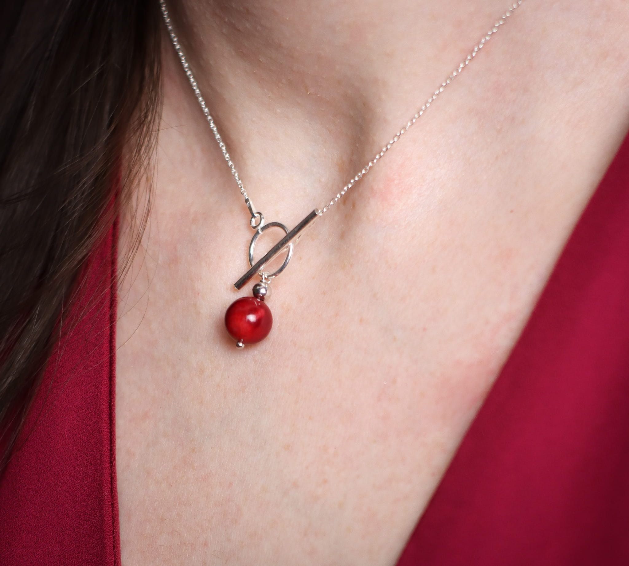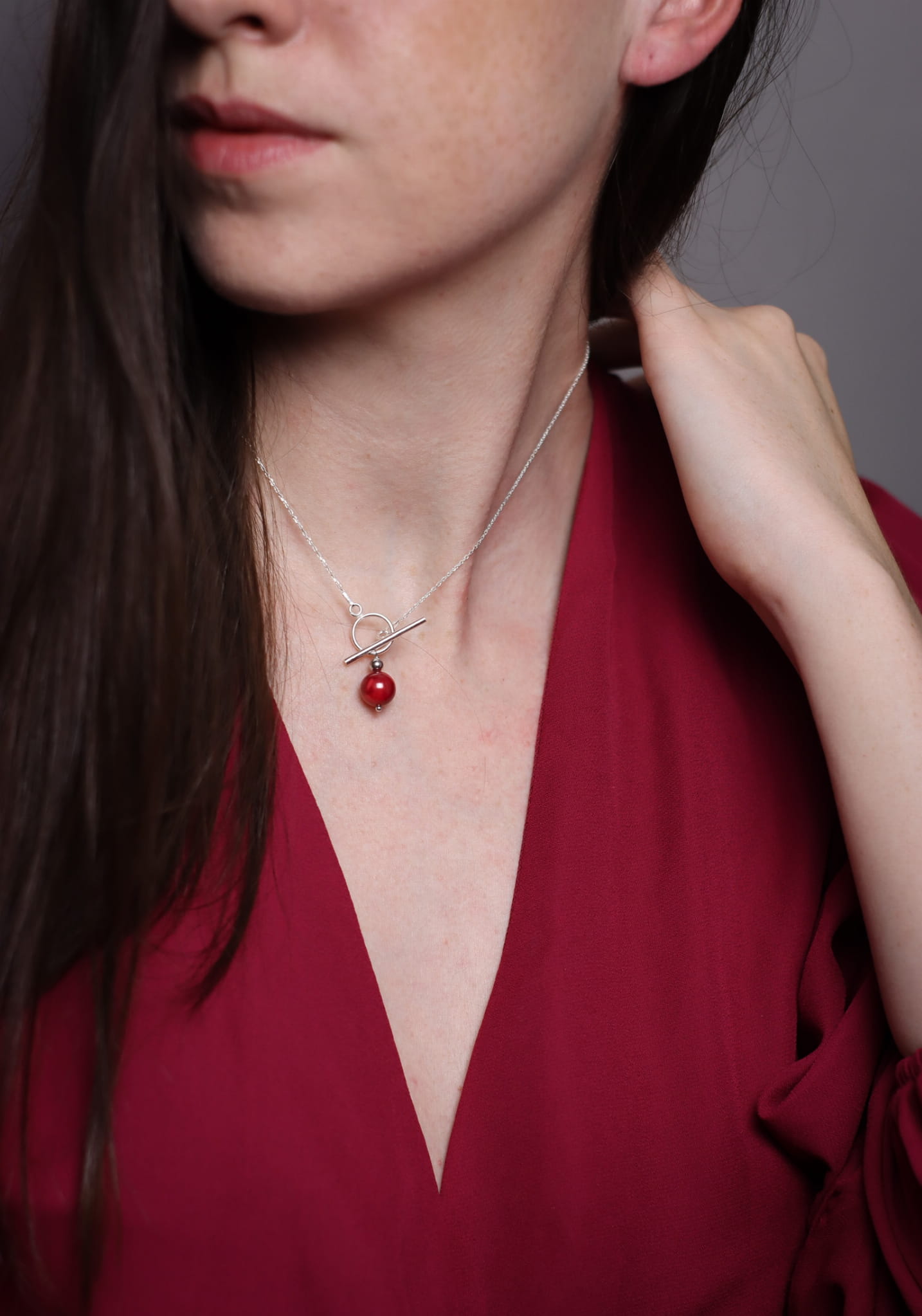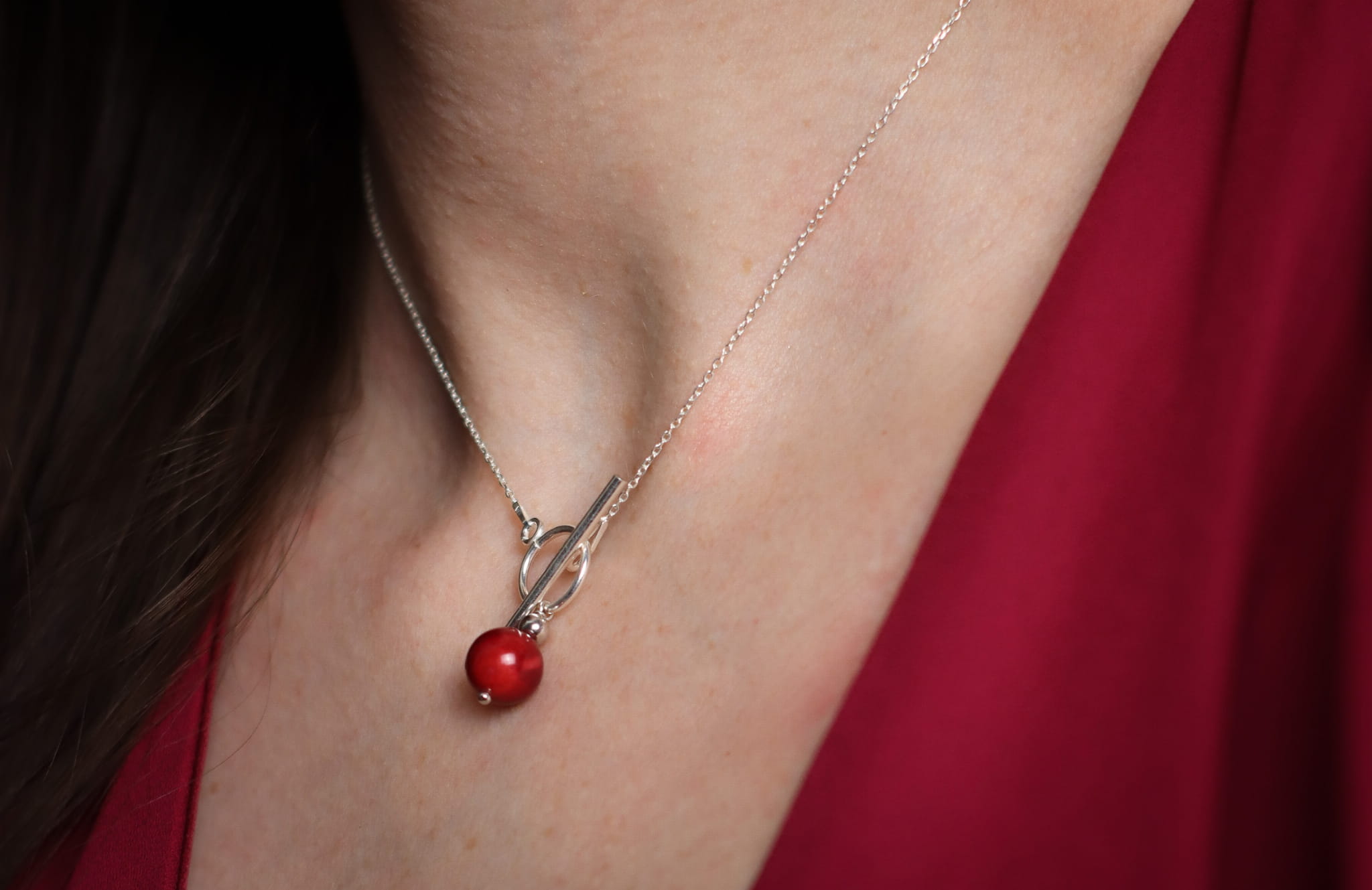 Ręcznie wykonany delikatny łańcuszek z klasycznego srebra pr.925 z zawieszką z kuleczki korala czerwonego.