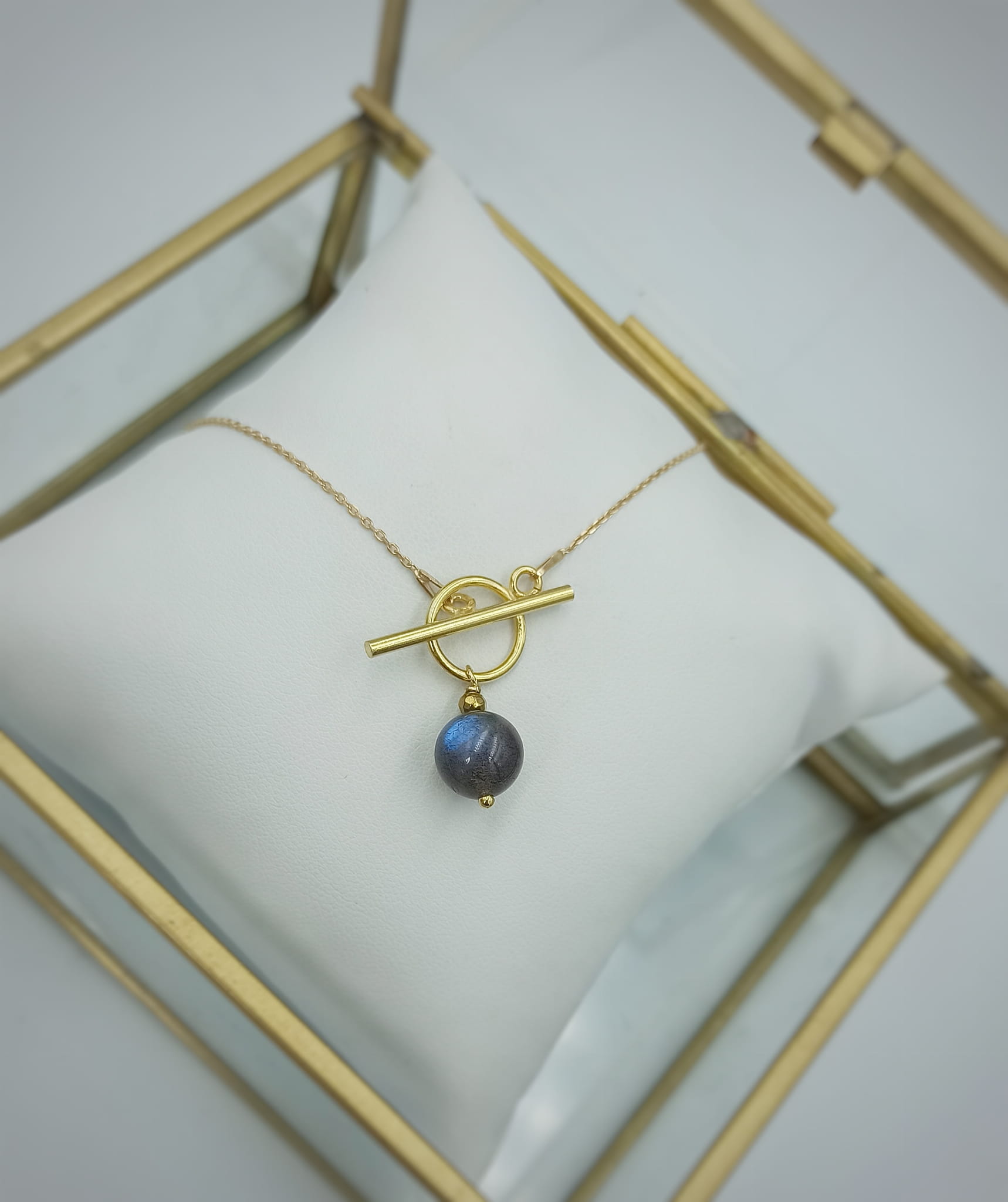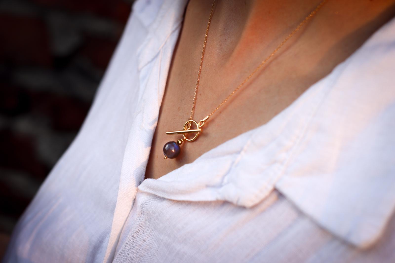 Ręcznie wykonany delikatny łańcuszek z pozłacanego srebra pr.925 z zawieszką z kuleczki pięknie mieniącego się labradoryt.