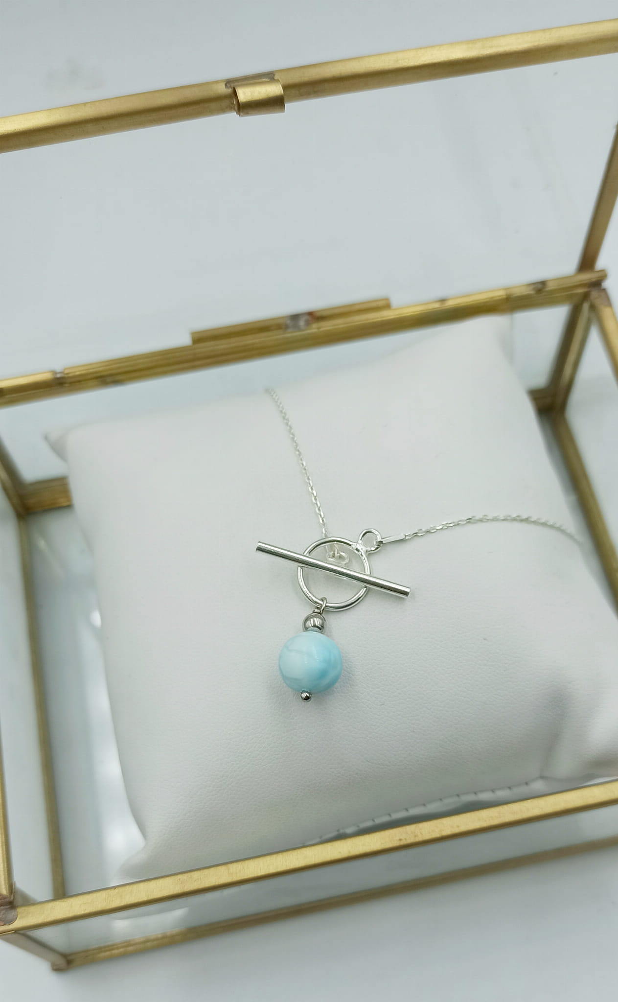Ręcznie wykonany delikatny łańcuszek z klasycznego srebra pr.925 z zawieszką z kuleczki błękitnego larimaru.