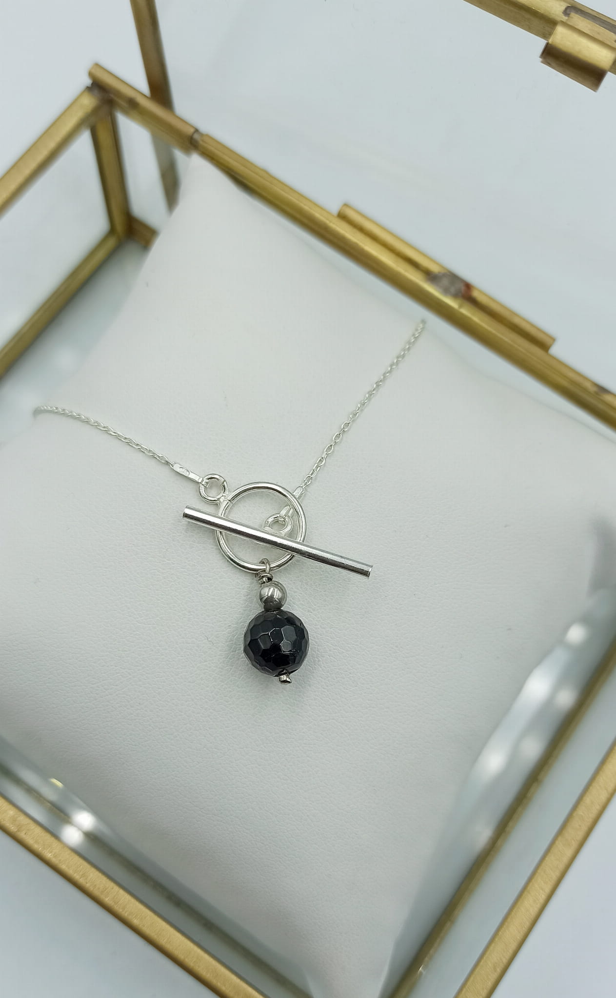 Ręcznie wykonany delikatny łańcuszek z klasycznego srebra pr.925 z zawieszką z kuleczki fasetowanego czarnego turmalinu.
