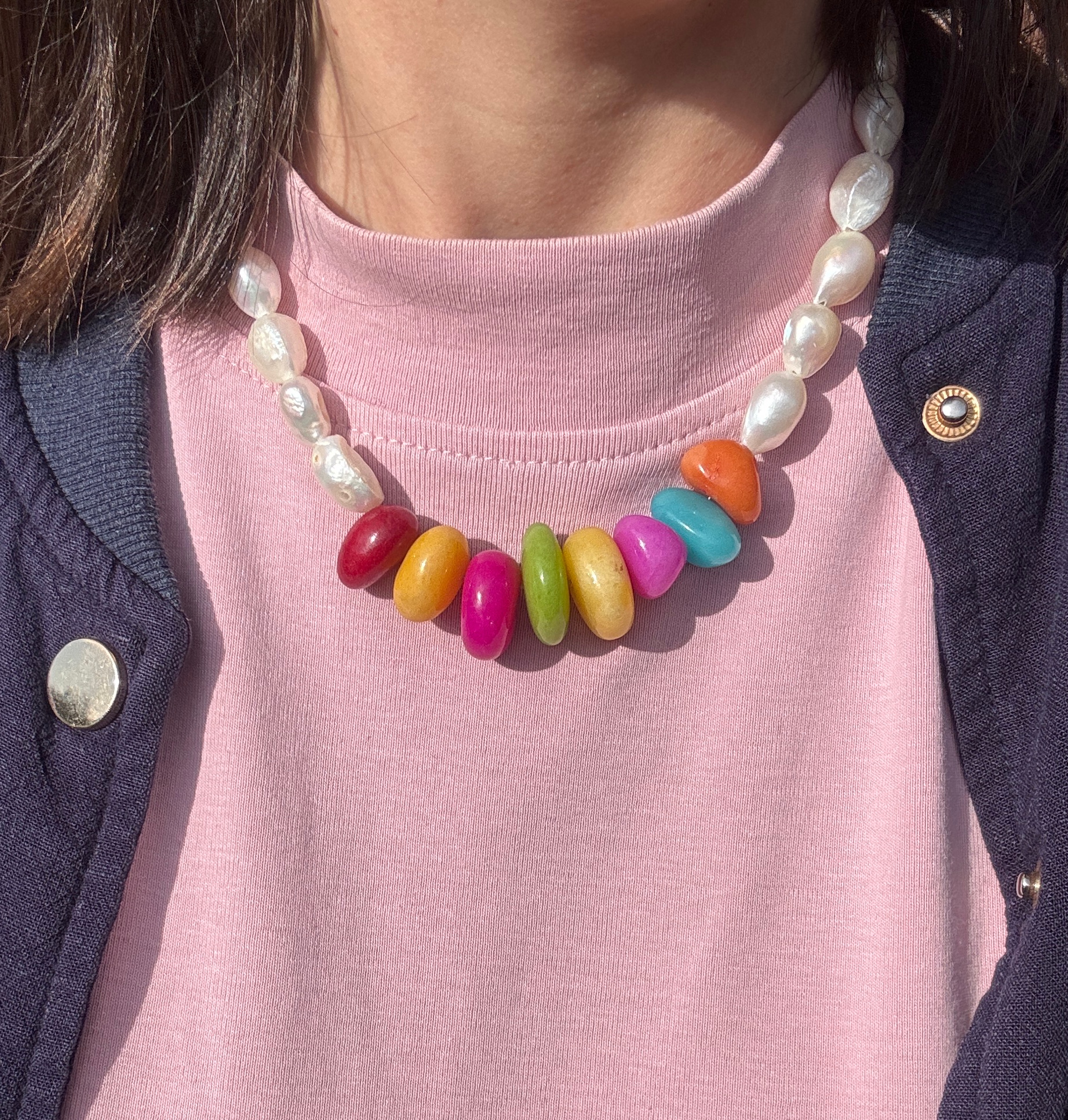 Naszyjnik Radość kolorowy jadeit i białe perły hodowane