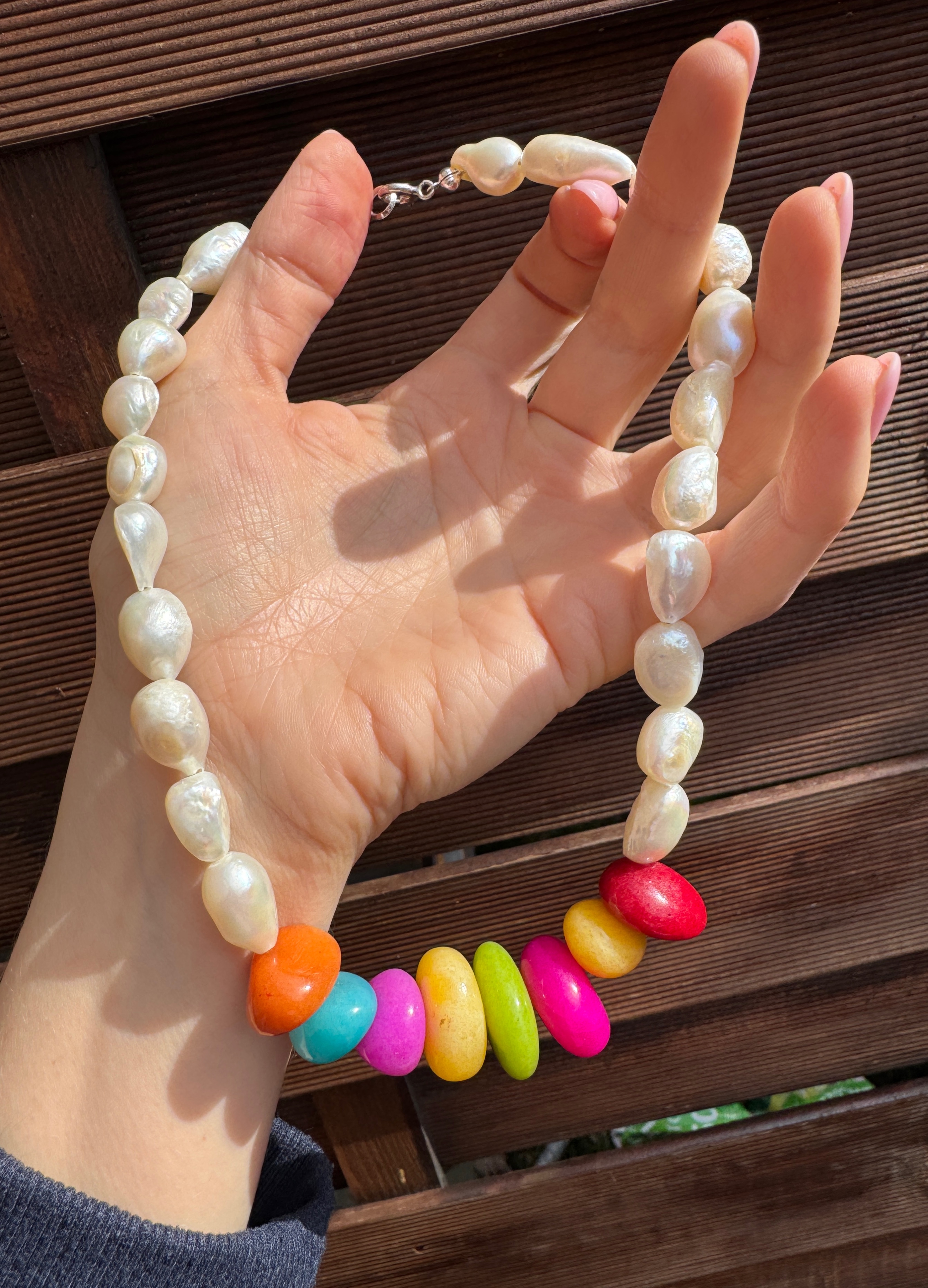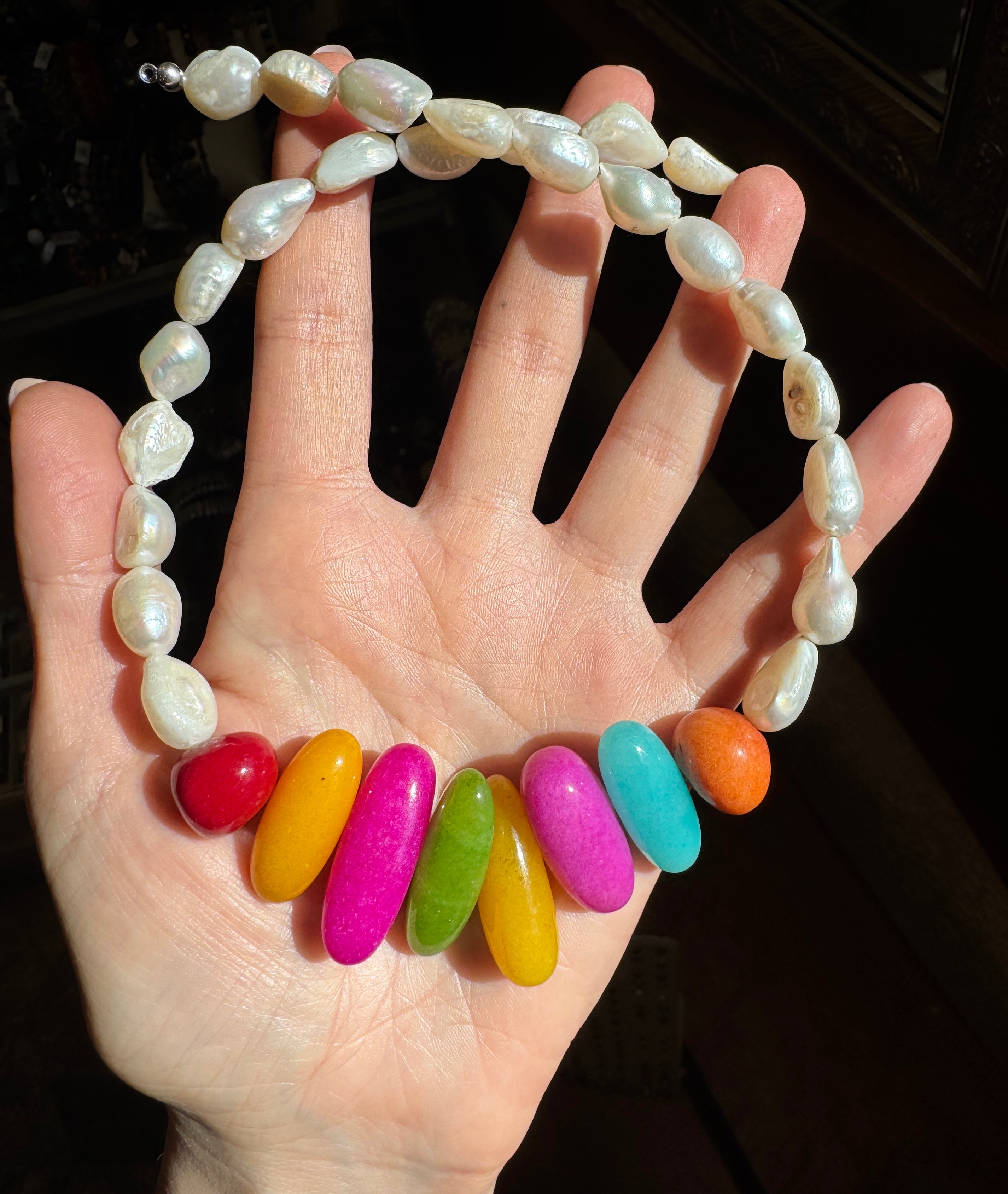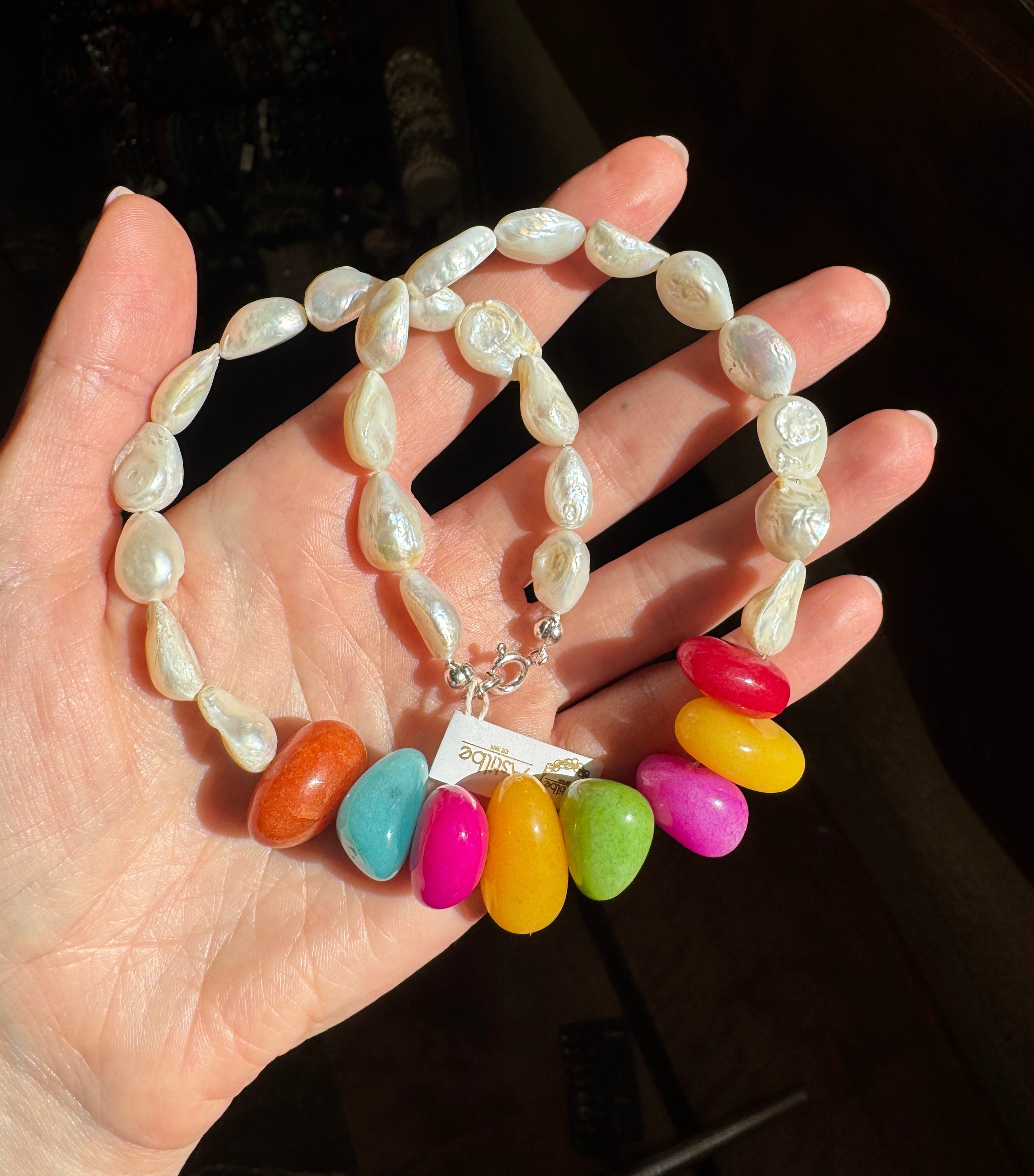 Naszyjnik Radość - ręcznie wykonany z kolorowych jadeitów w pięknych energetycznych kolorach, z białych pereł hodowanych oraz srebra pr.925