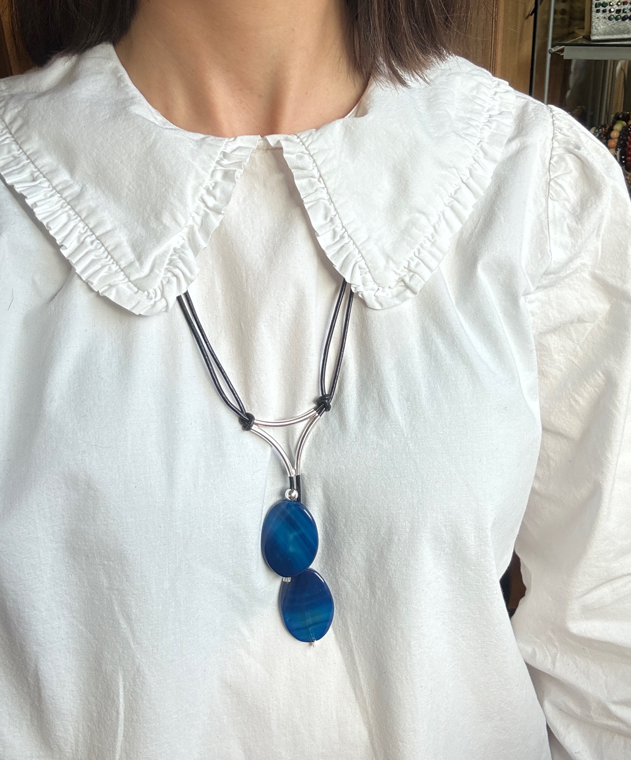 Naszyjnik Trójkąt ręcznie wykonany z niebieskiego agatu i srebra pr.925 oraz rzemienia w czarnym kolorze.