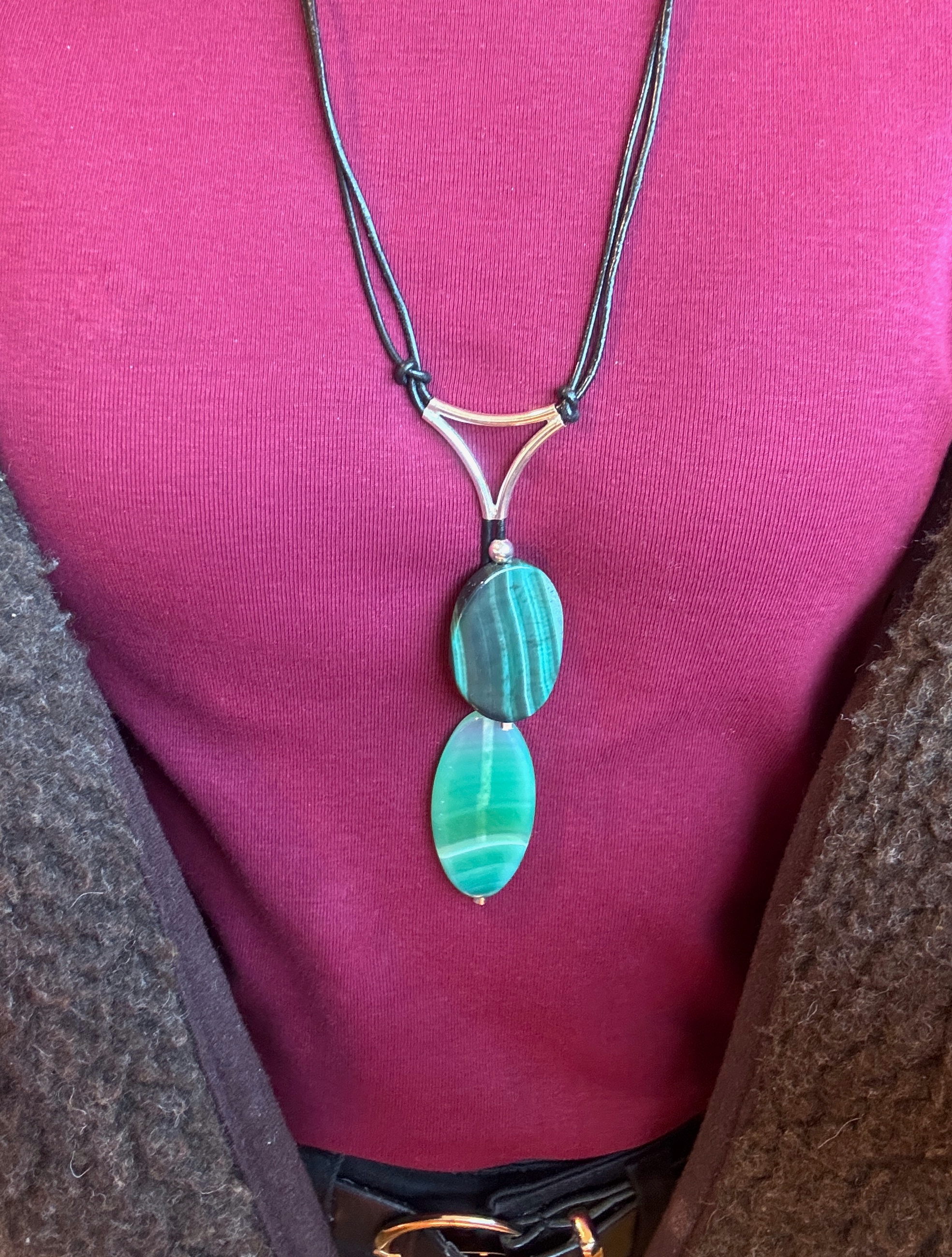 Naszyjnik Trójkąt ręcznie wykonany z zielonego agatu i srebra pr.925 oraz rzemienia w czarnym kolorze.
