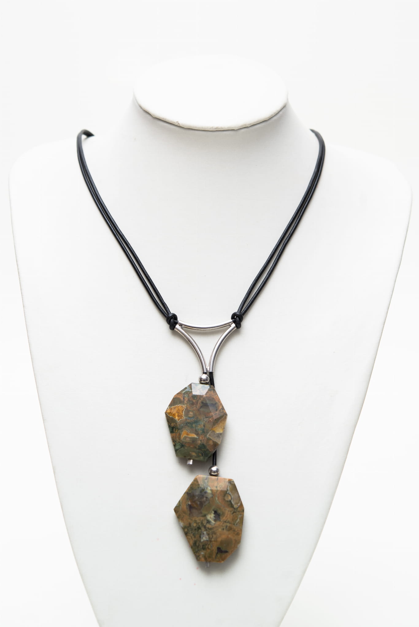 Naszyjnik Trójkąt ręcznie wykonany z pięknych zielonych jaspisów- ryolitów, srebra pr.925 oraz rzemienia w czarnym kolorze.