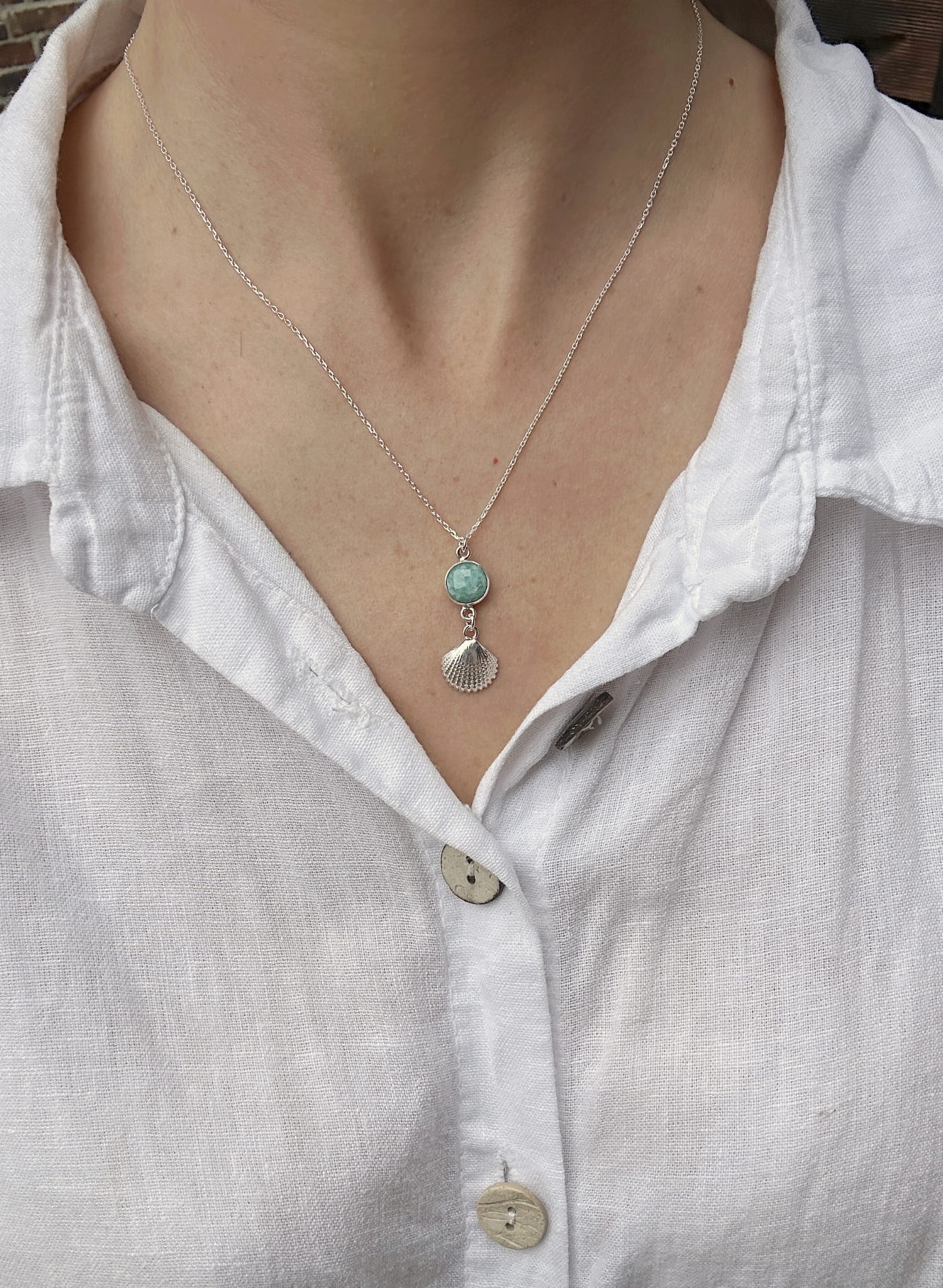 Naszyjnik z fasetowanego amazonitu i srebrnej muszelki na łańcuszku z klasycznego srebra pr. 925