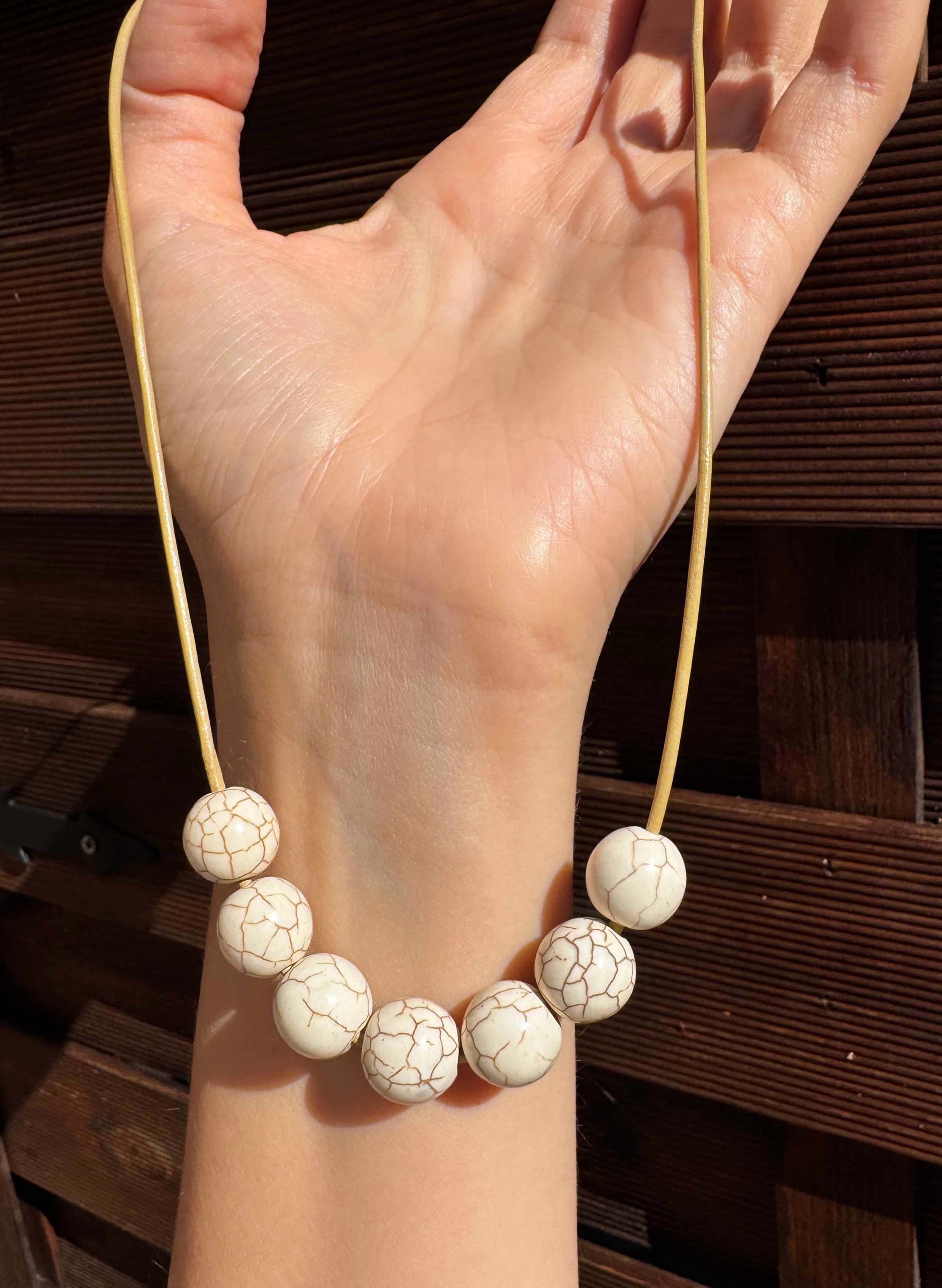 Piękny ręcznie robiony naszyjnik z howlitu w odcieniach beżu , srebra i bezowego rzemienia.