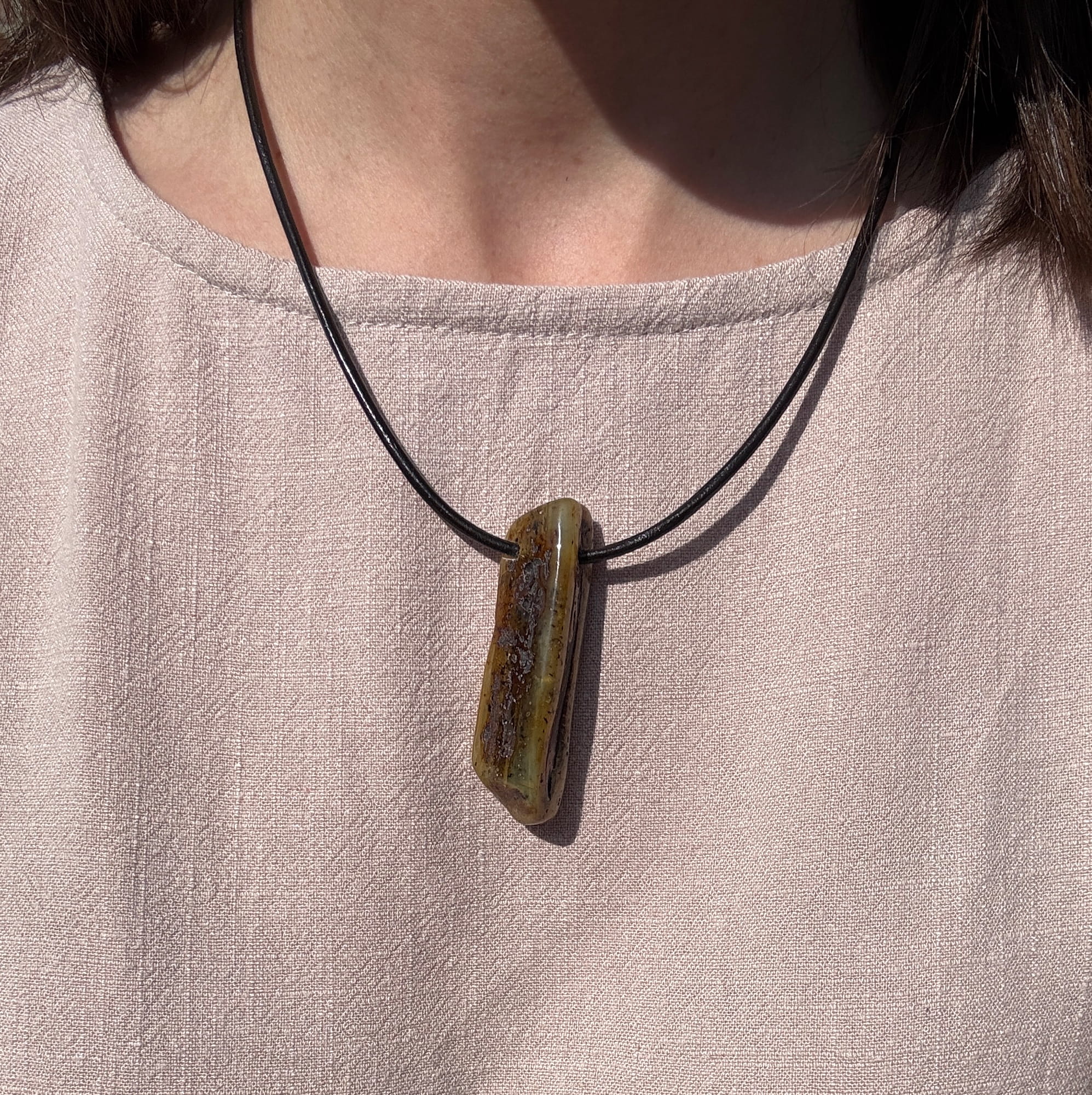 Piękny i niepowtarzalny ręcznie robiony naszyjnik z naturalnego bursztynu, srebra i brązowego rzemienia.