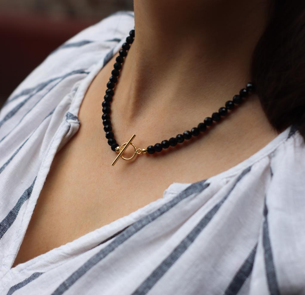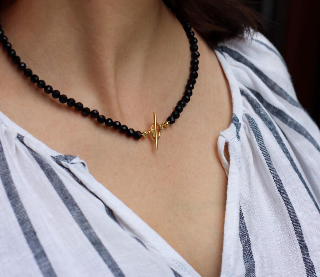 Piękny, ręcznie wykonany naszyjnik z fasetowanych kulek czarnego turmalinu i srebra pr. 925