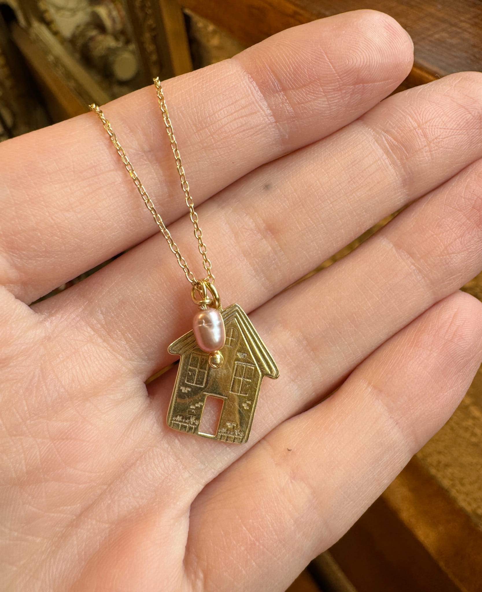 Naszyjnik z pięknej różowej perły hodowanej i domku na łańcuszku z pozłacanego srebra pr.925