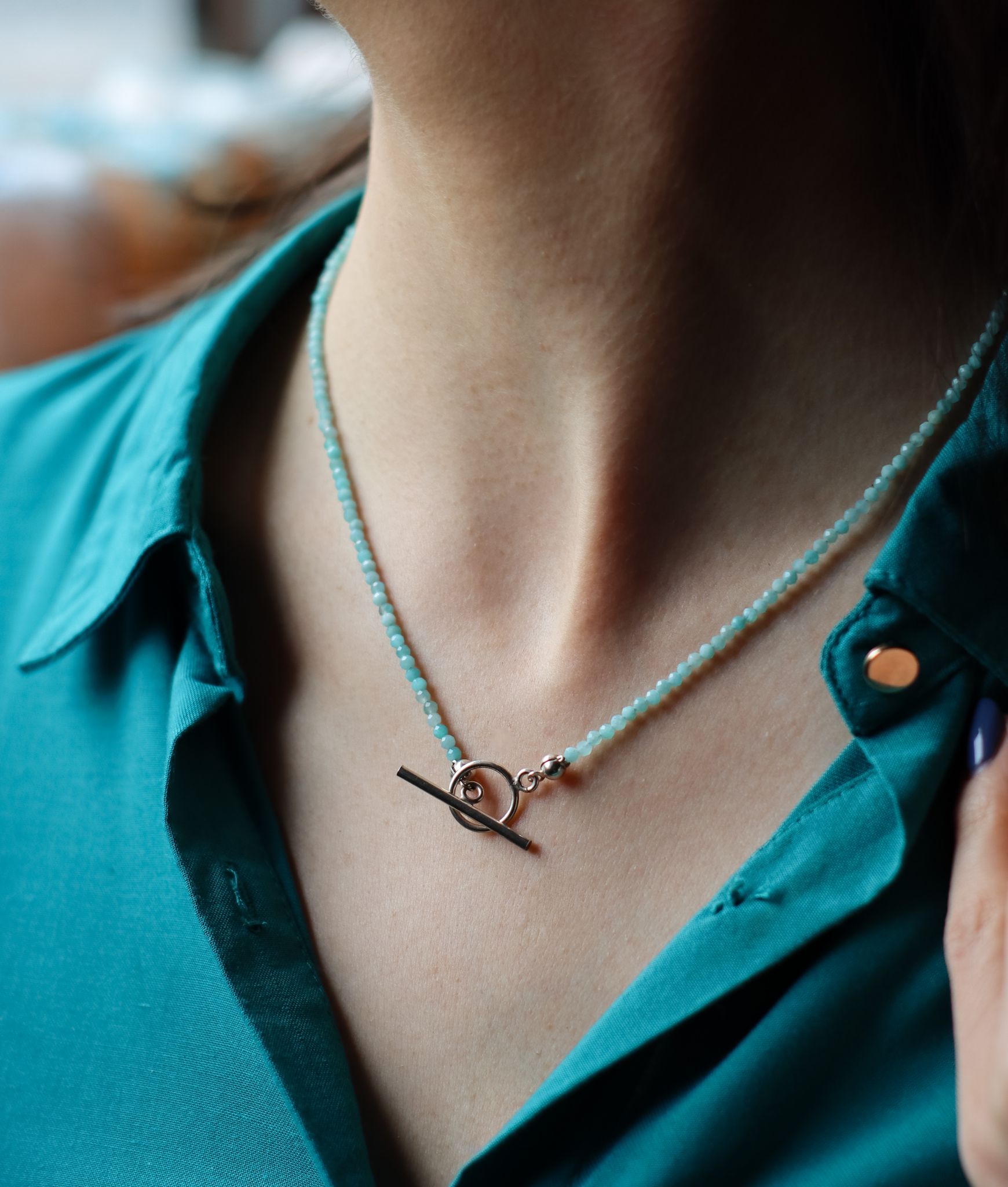 Naszyjnik ręcznie wykonany z drobnych, fasetowanych amazonitów oraz srebra pr.925