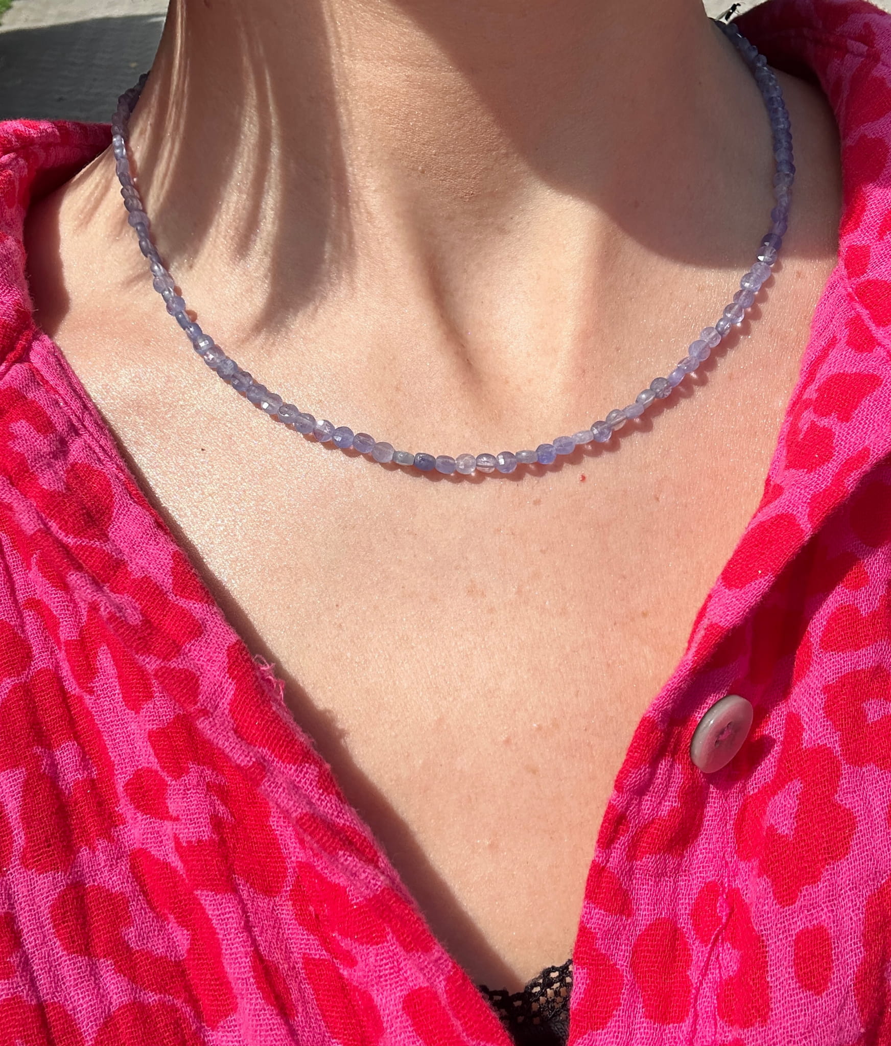 Naszyjnik ręcznie wykonany z drobnych, fasetowanych fioletowych tanzanitów w kształcie pastylek z klasycznym zapięciem kółeczko i federing ze złoconego srebra pr.925