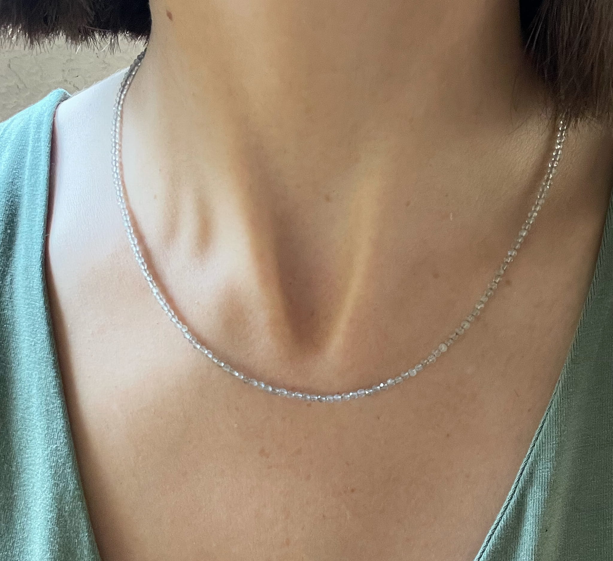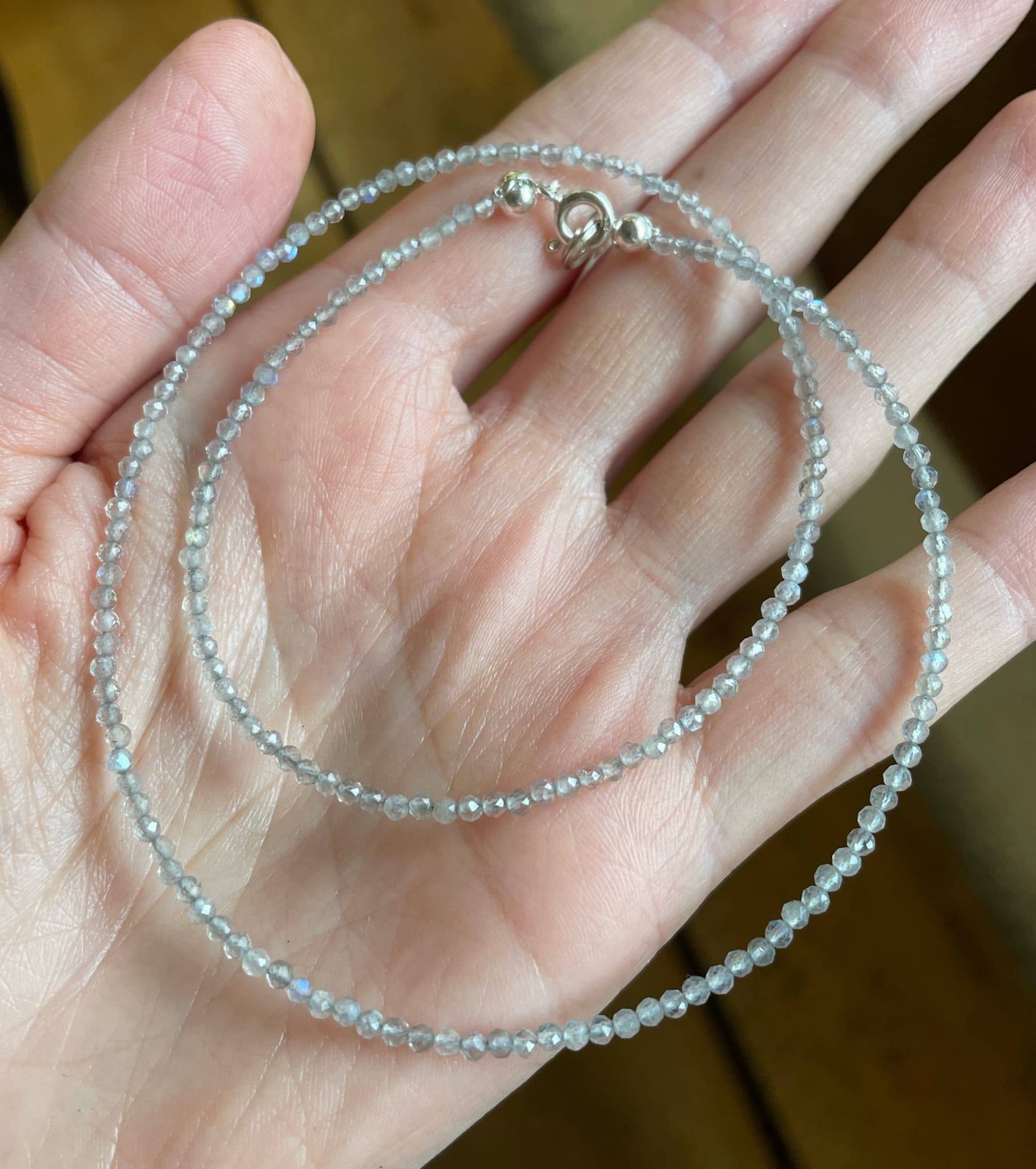 Naszyjnik ręcznie wykonany z drobnych, fasetowanych labradorytow z klasycznym zapięciem kółeczko i federing ze srebra pr.925