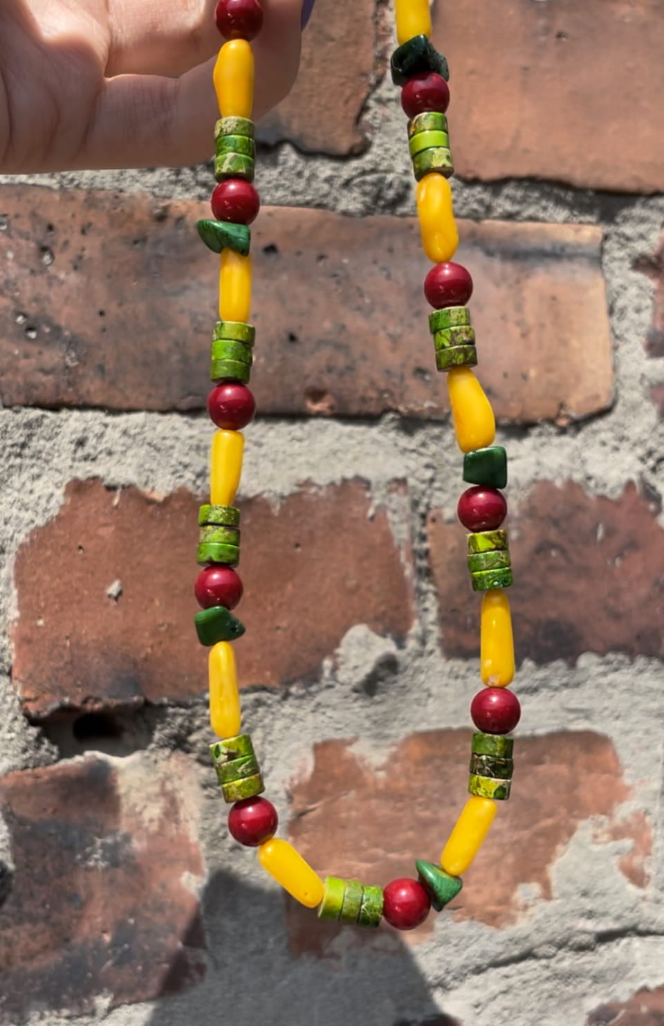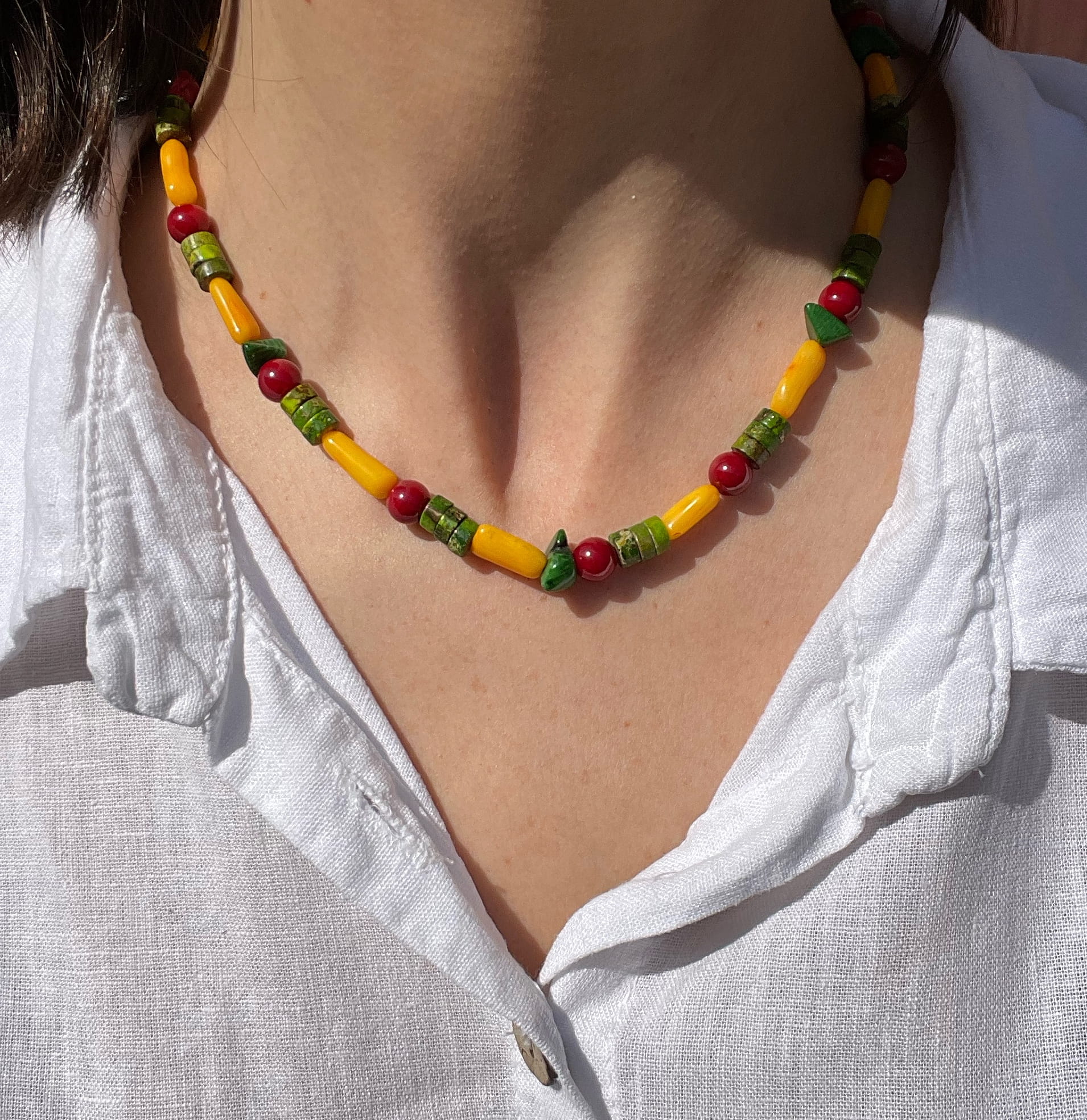 Piękny, ręcznie wykonany naszyjnik, w którym znajdziesz koral w odcieniu żółci, czerwieni i zieleni, zielony jaspis cesarski oraz zapięcie ze srebra klasycznego pr.925
