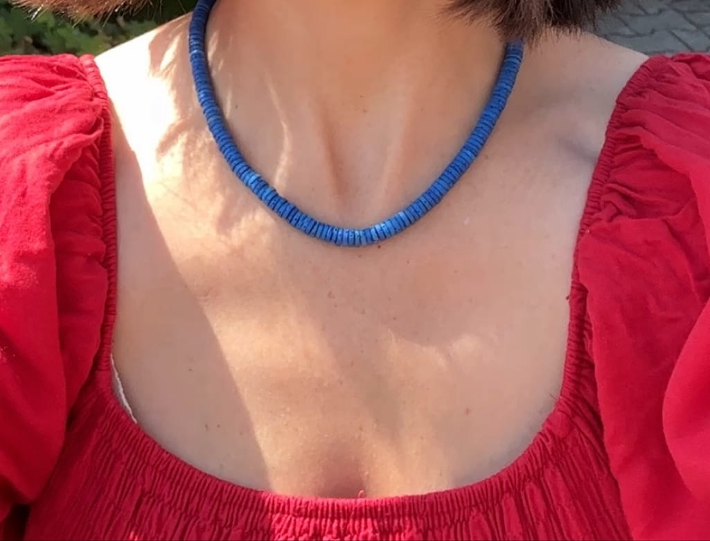 Piękny, ręcznie wykonany naszyjnik Margaret, w którym znajdziesz plasterki lawy wulkanicznej w odcieniu granatowym oraz zapięcie ze srebra pr.925