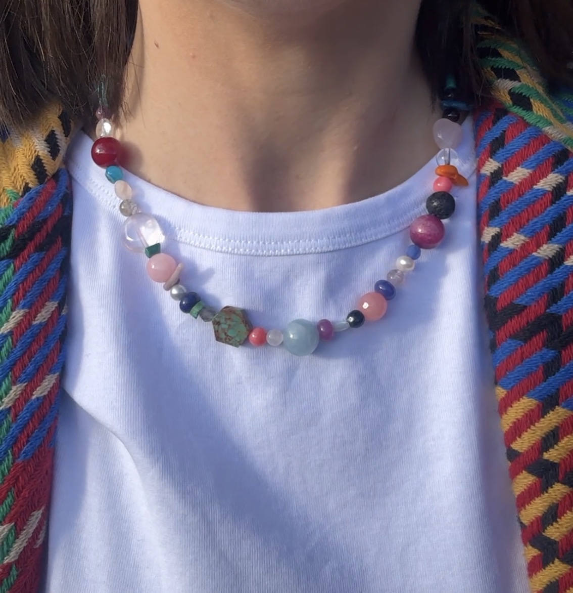 Turkus, koral, agat, onyks, malachit, labradoryt, jaspis, perłe hodowaną, lawe wulkaniczną, akwamaryn, jadeit, kryształ górski, kyanit,turmalin, kwarc różowy