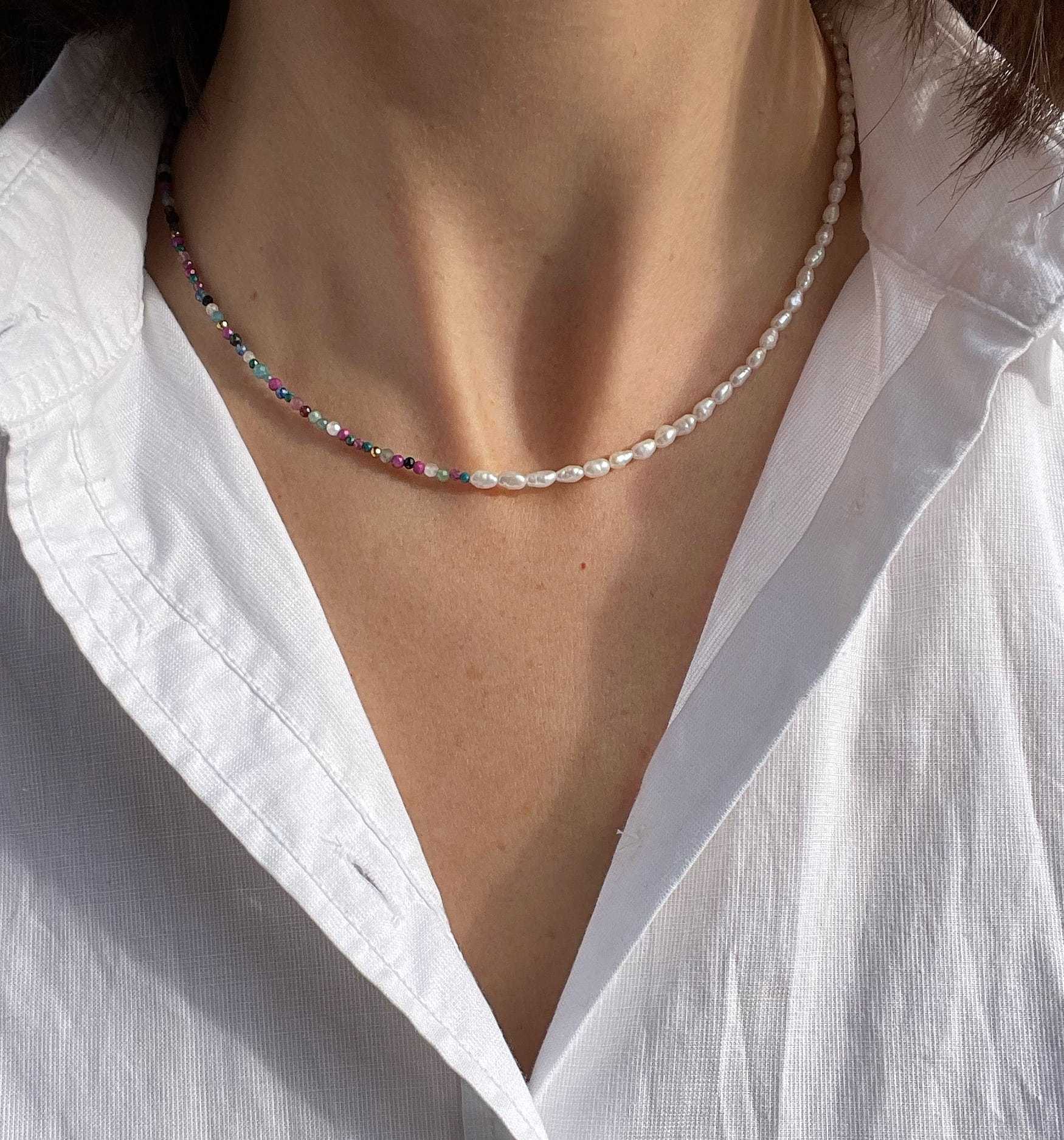 Piękny, ręcznie wykonany, niepowtarzalny naszyjnik, w którym znajdziesz kamienie naturalne, białe perły hodowane oraz zapięcie ze srebra złoconego pr.925