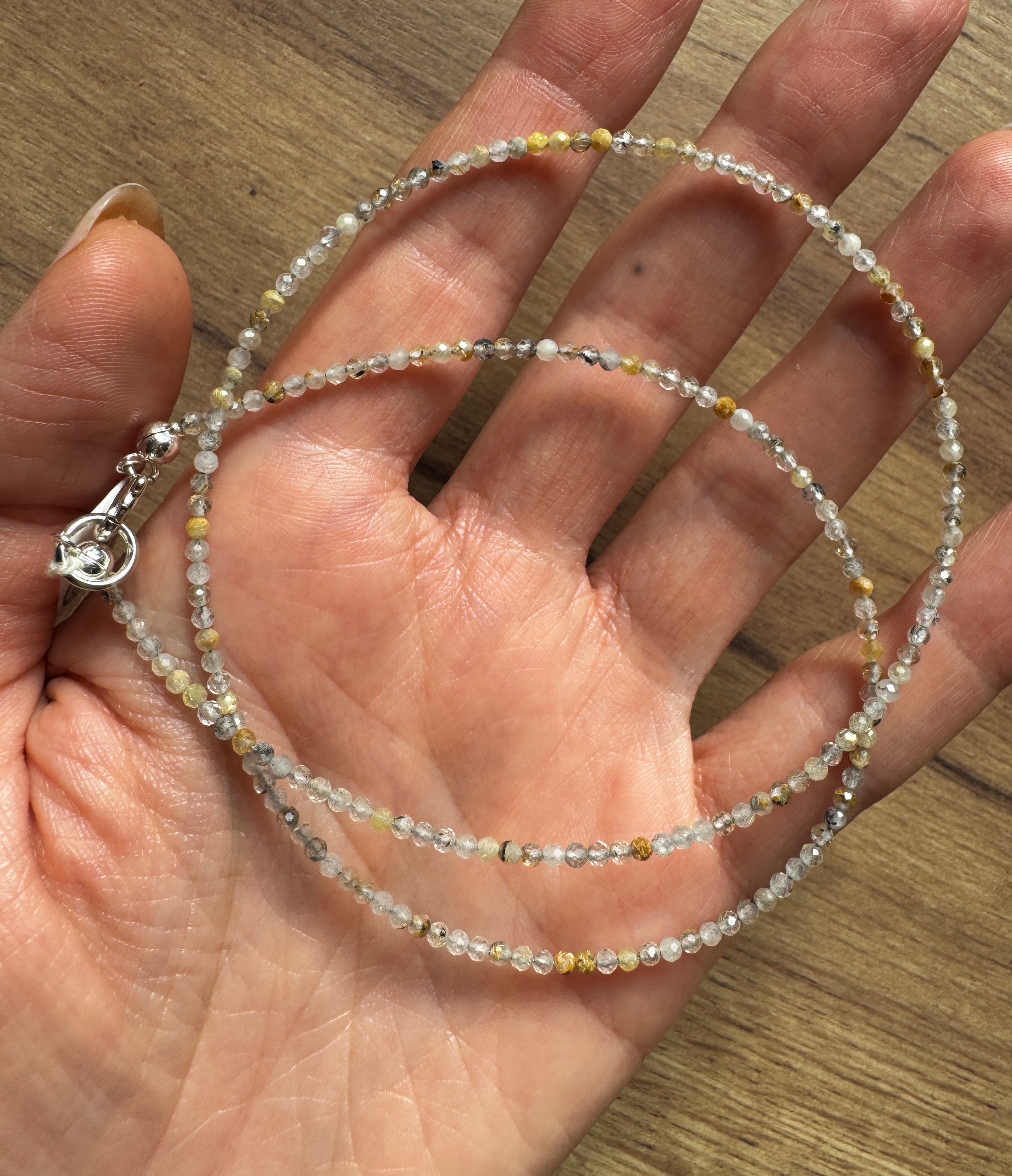 Ręcznie wykonany naszyjnik klasyczny z fasetowanych kwarcy z rutylem oraz srebra pr.925.