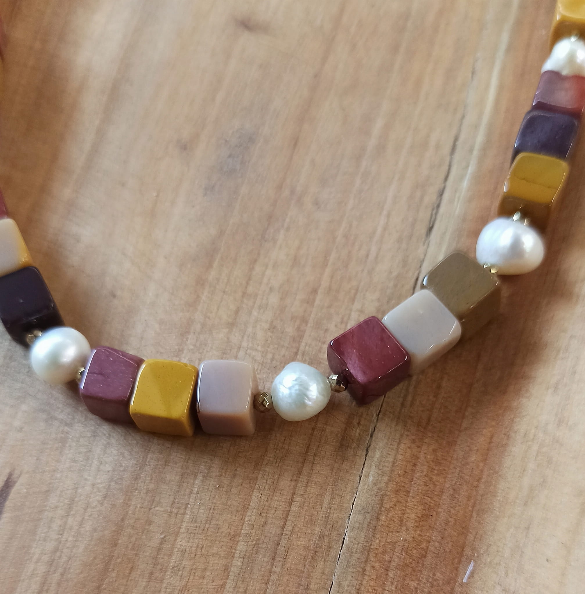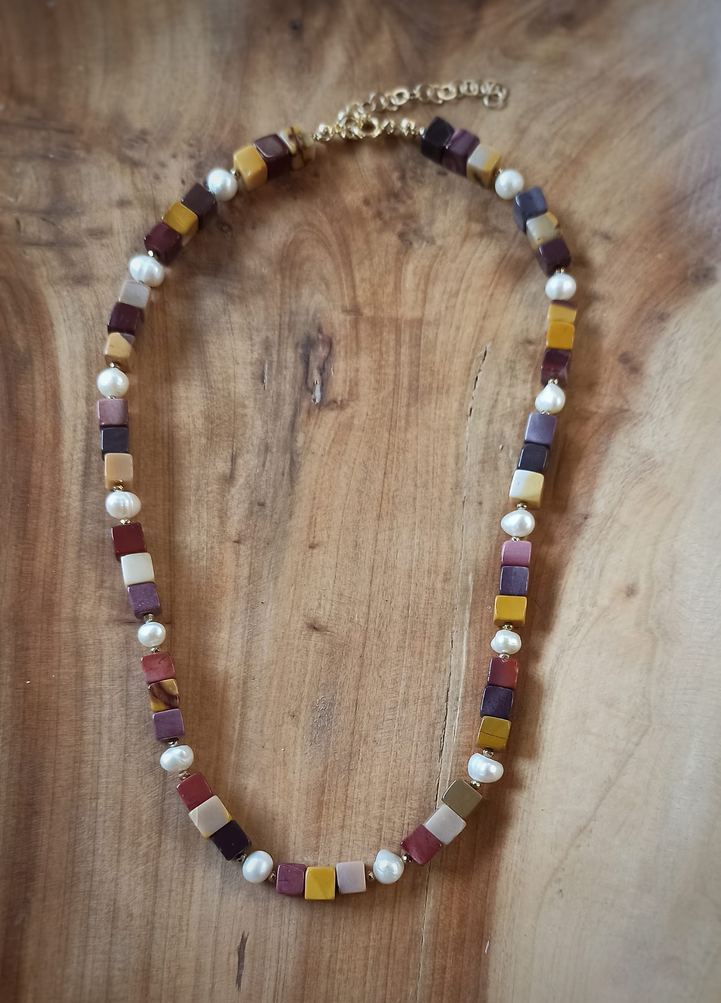 Ręcznie wykonany naszyjnik klasyczny z kosteczek mokaitu- pięknej odmiany jaspisu, białych pereł hodowanych i złotych hematytów oraz pozłacanego srebra pr.925