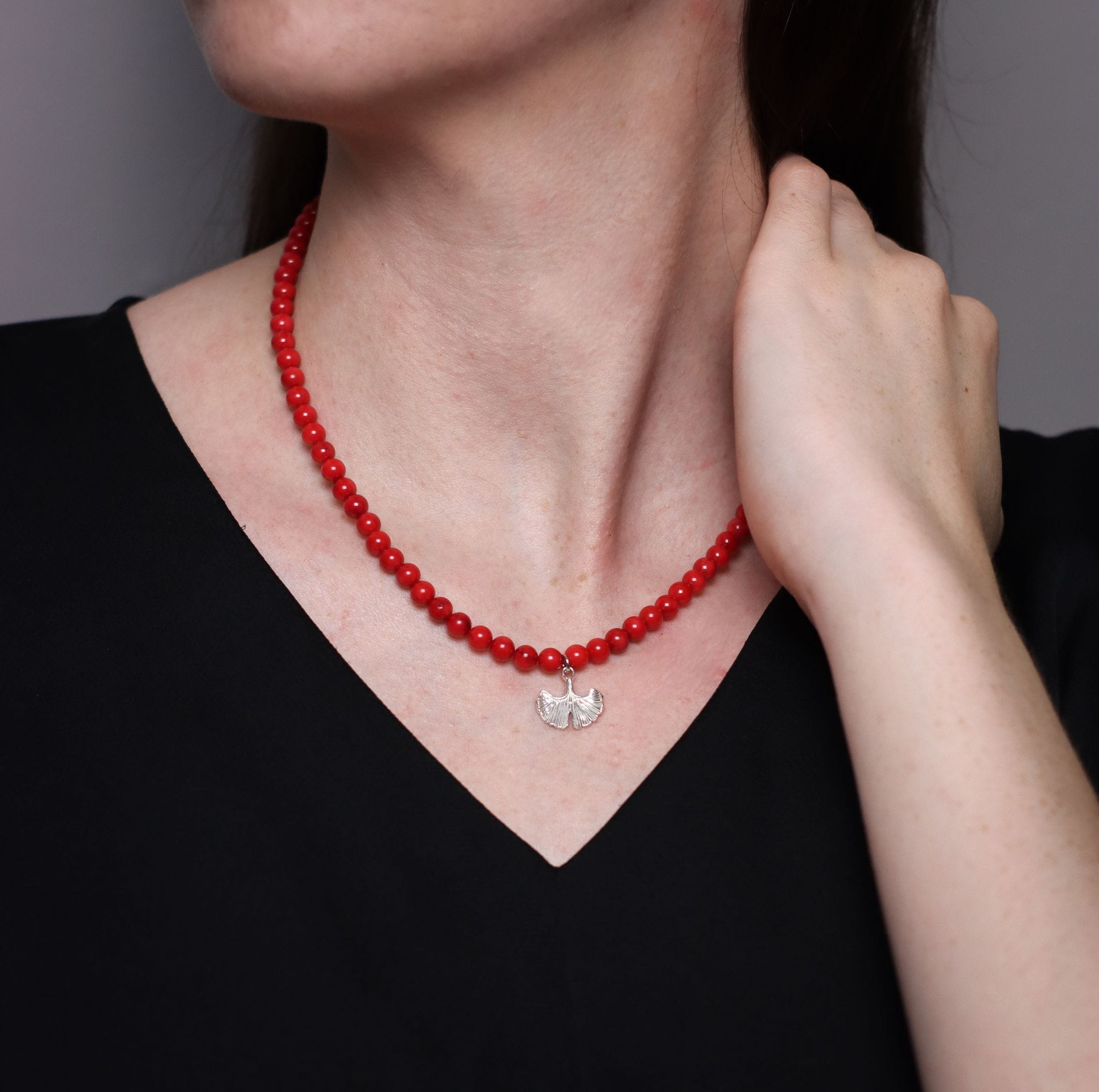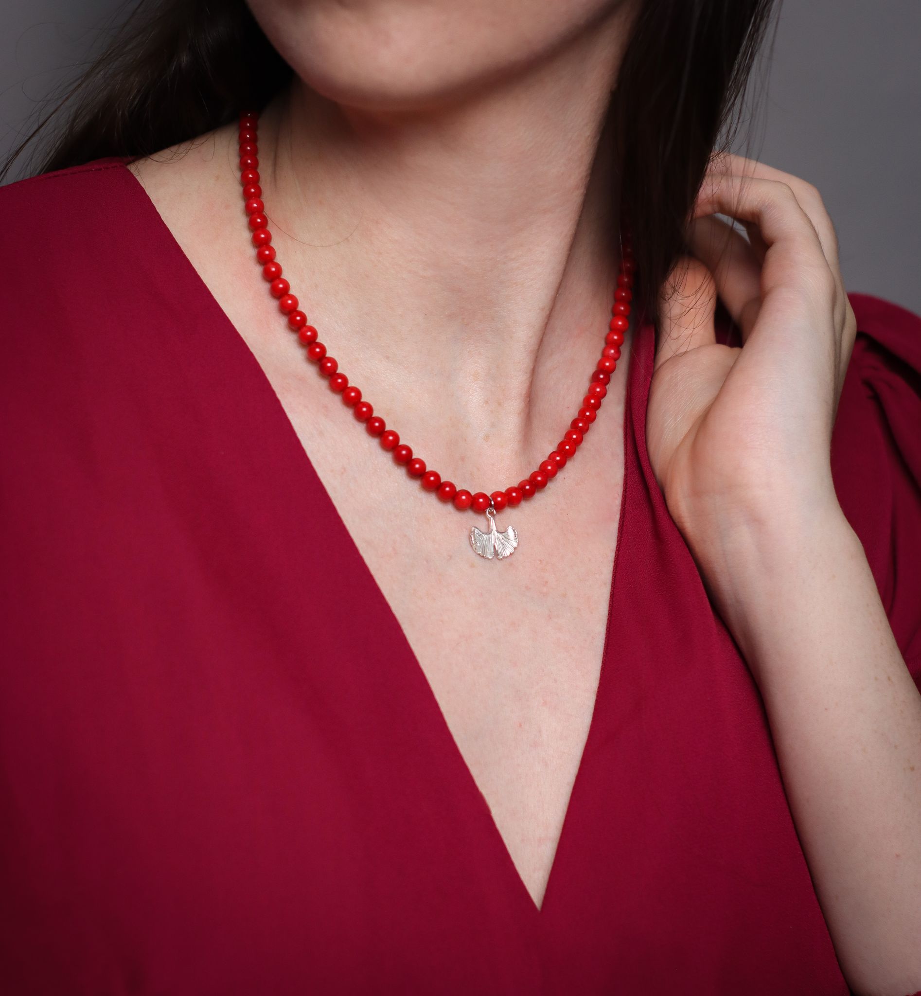 Naszyjnik klasyczny koral czerwony i liść miłorzębu