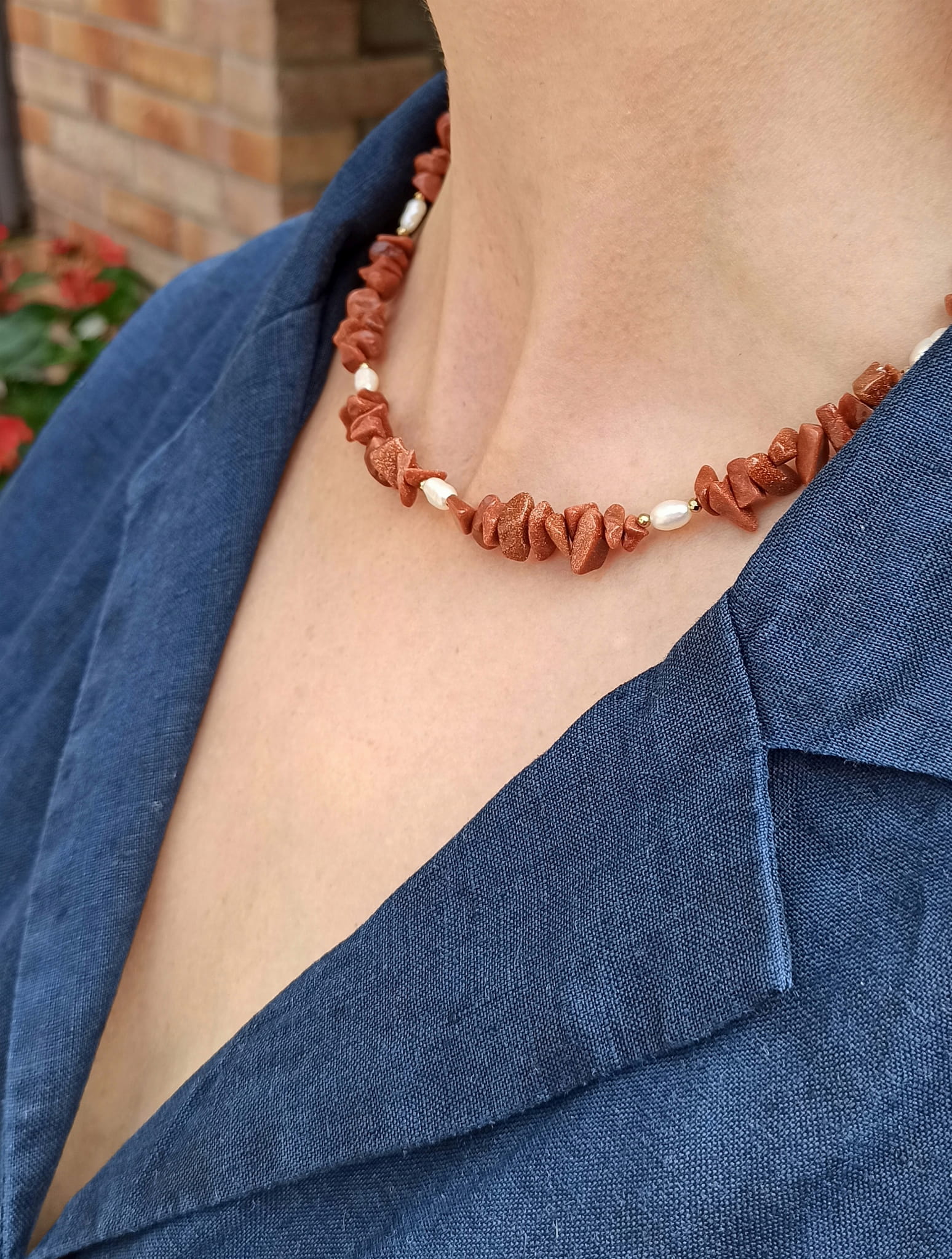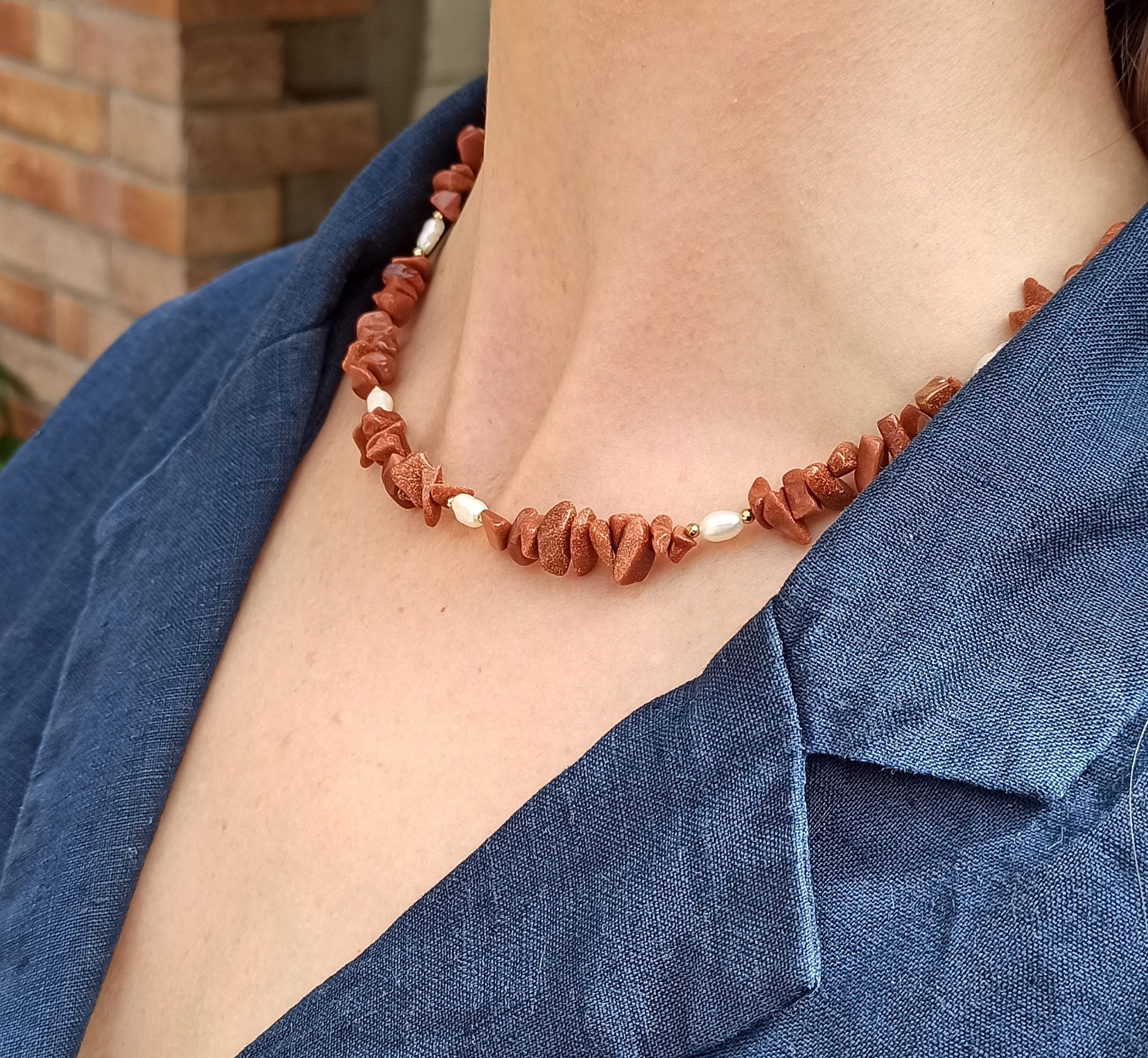 Piękny naszyjnik klasyczny z drobnego piasku pustyni, białych pereł i złotego hematytu.