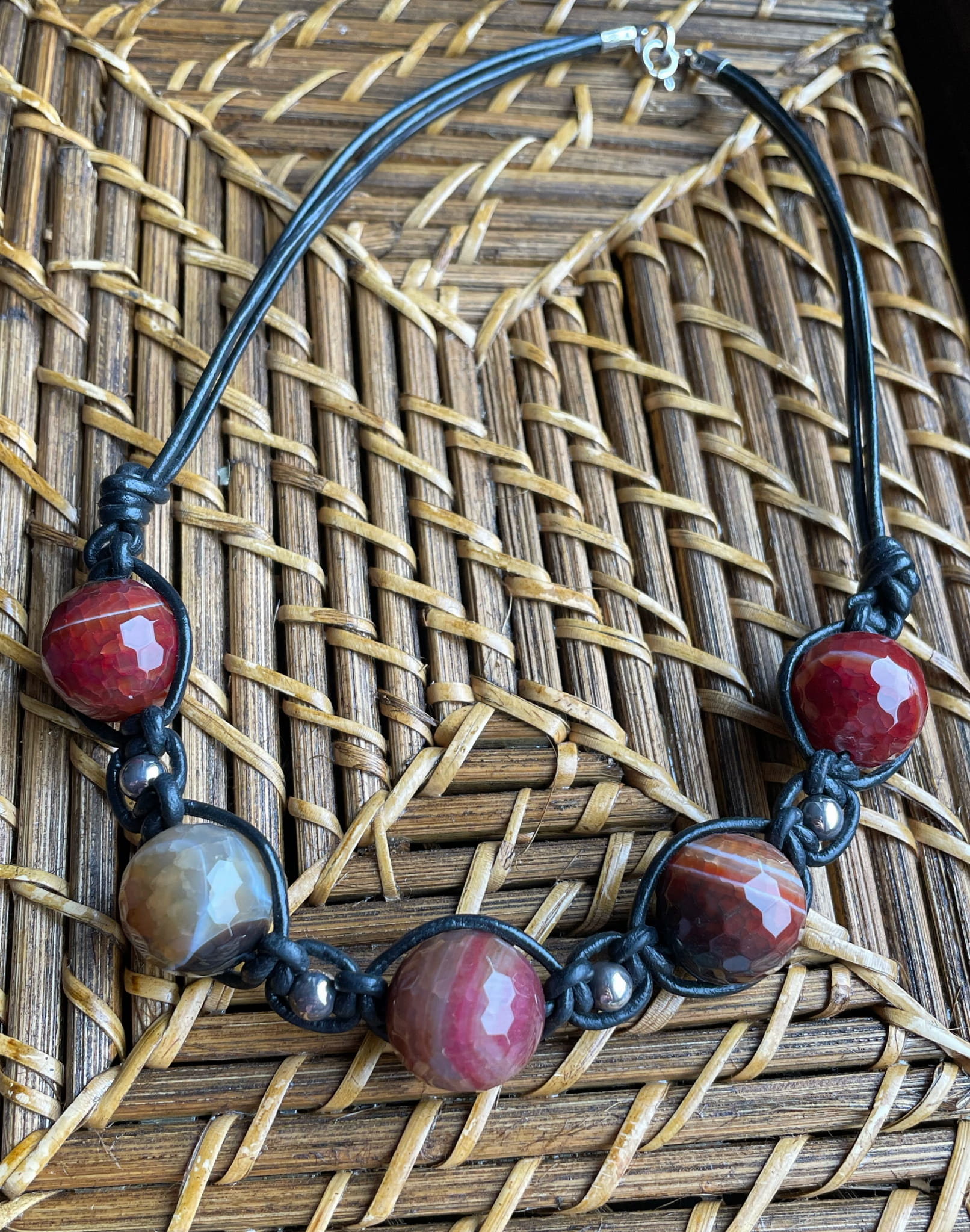 Naszyjnik ręcznie wykonany z kolorowych, fasetowanych agatów , srebra pr.925 oraz rzemienia w czarnym kolorze.