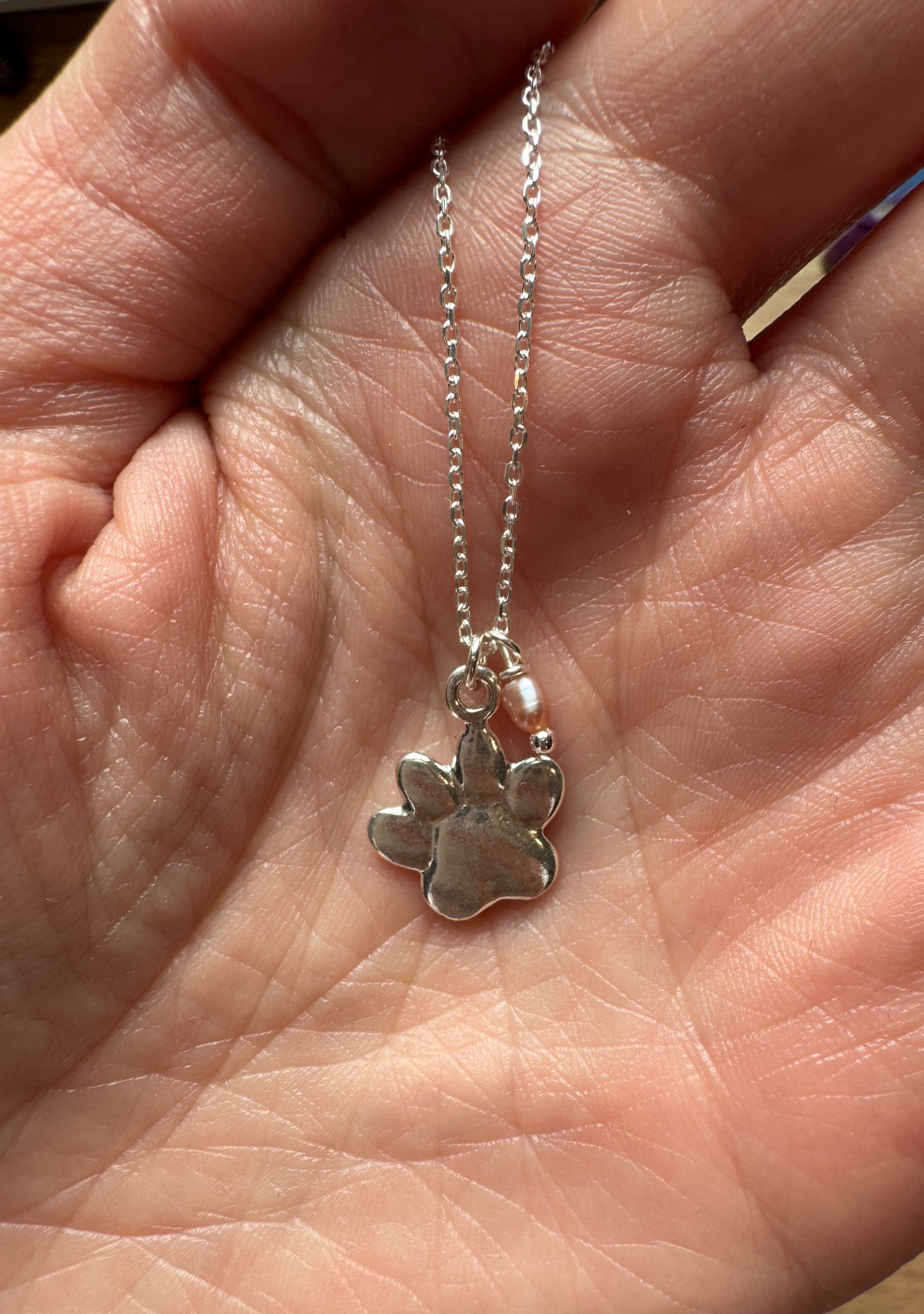 Naszyjnik łapka psa i różowa perła hodowana na łańcuszku ze srebra pr. 925