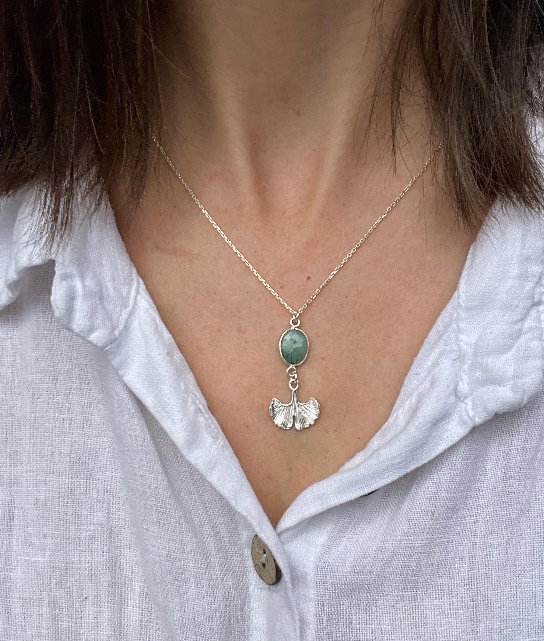 Naszyjnik z fasetowanego szmaragduz motywem miłorzębu na łańcuszku z klasycznego srebra pr. 925