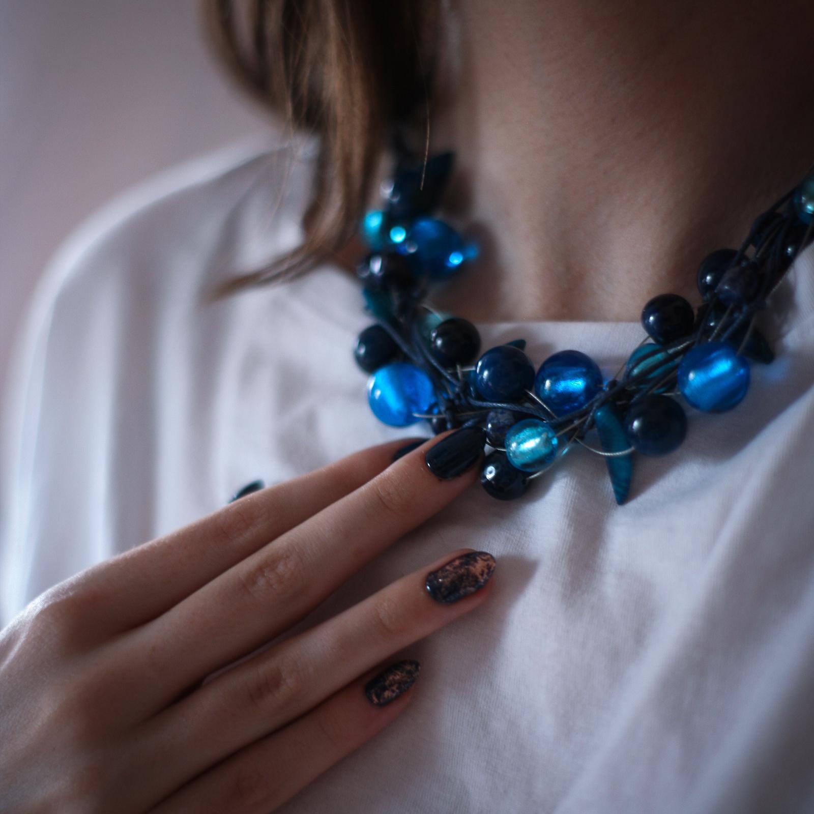 Niebieska Sieć Klasyczna to naszyjnik wykonany z kamieni półszlachetnych (lapis lazuli, sodalit, agat, koral niebieski) i szkła weneckiego.