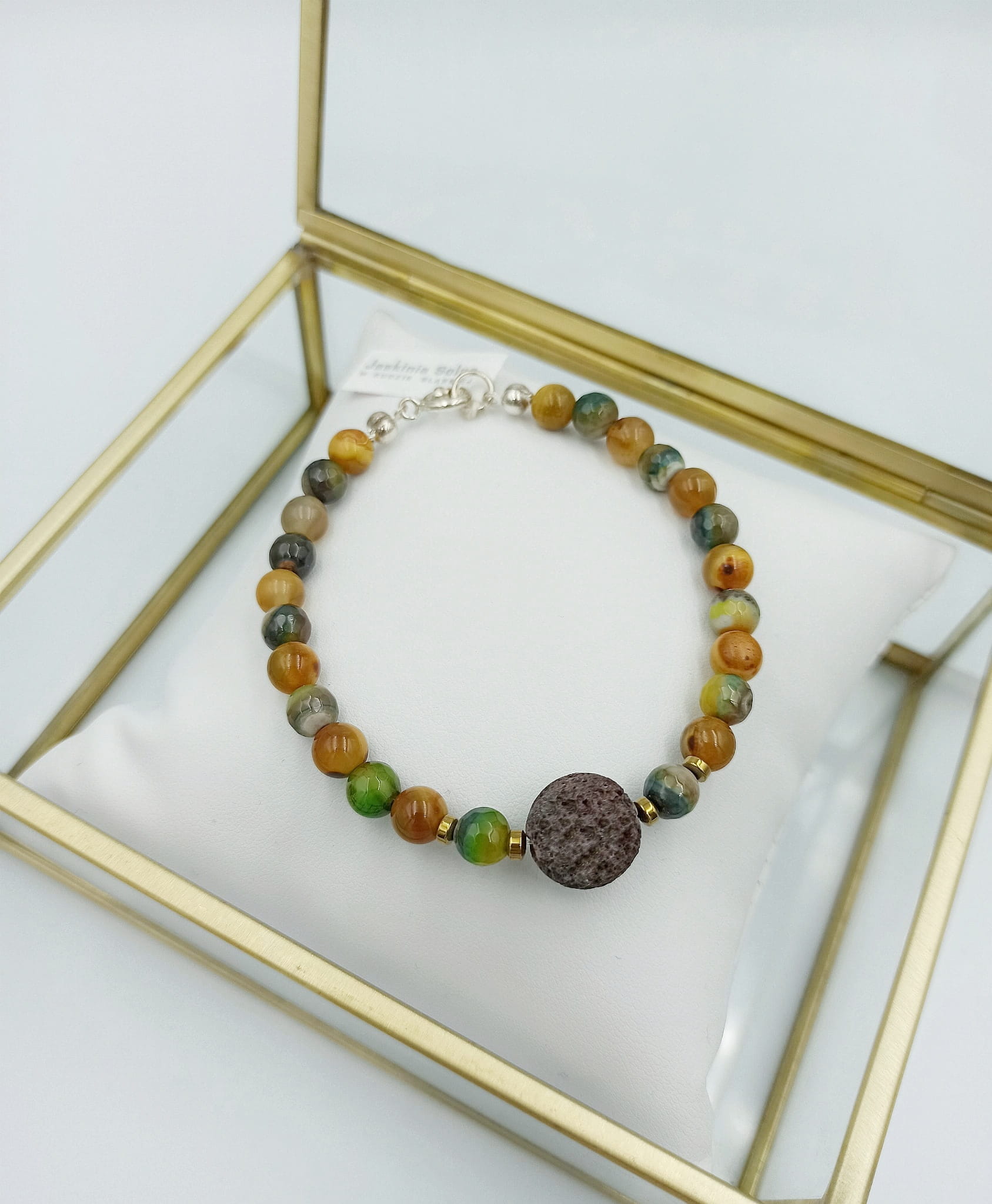 Bransoletka Orizaba z Kolekcji Aromaterapeutycznej wykonana jest z brązowej lawy wulkanicznej, złotego hematytu oraz agatów w kolorach ziemi.