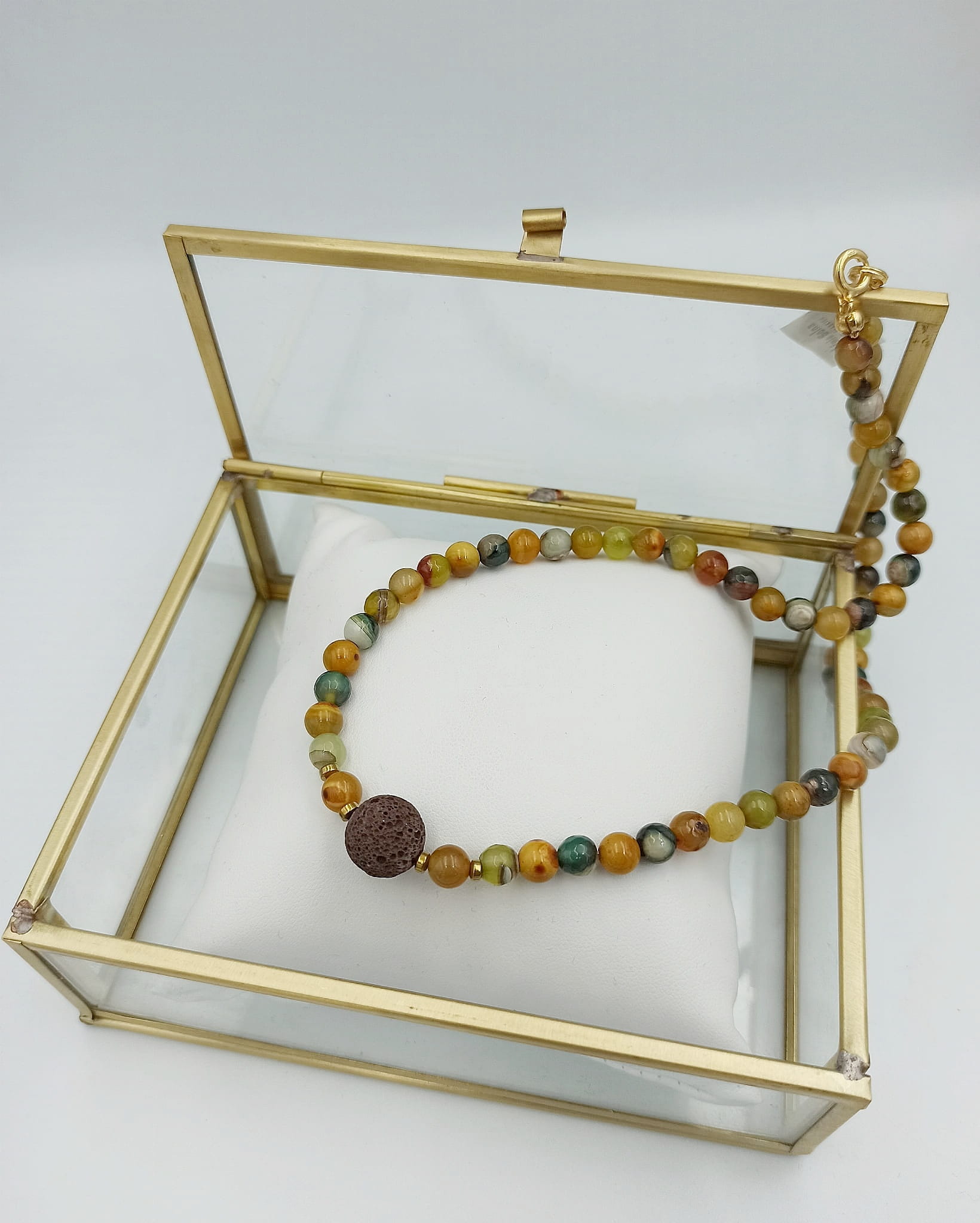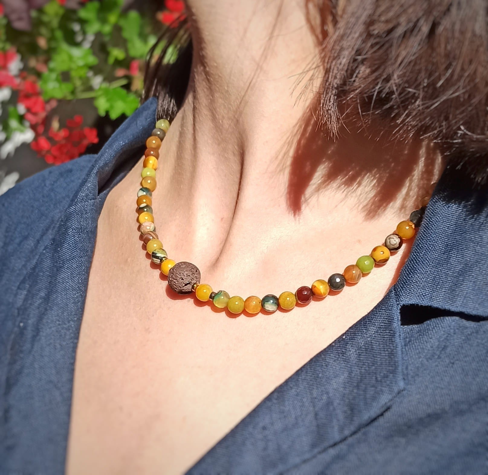 Naszyjnik Orizaba z Kolekcji Aromaterapeutycznej wykonany jest z brązowej lawy wulkanicznej, złotego hematytu oraz agatów w kolorach ziemi.
