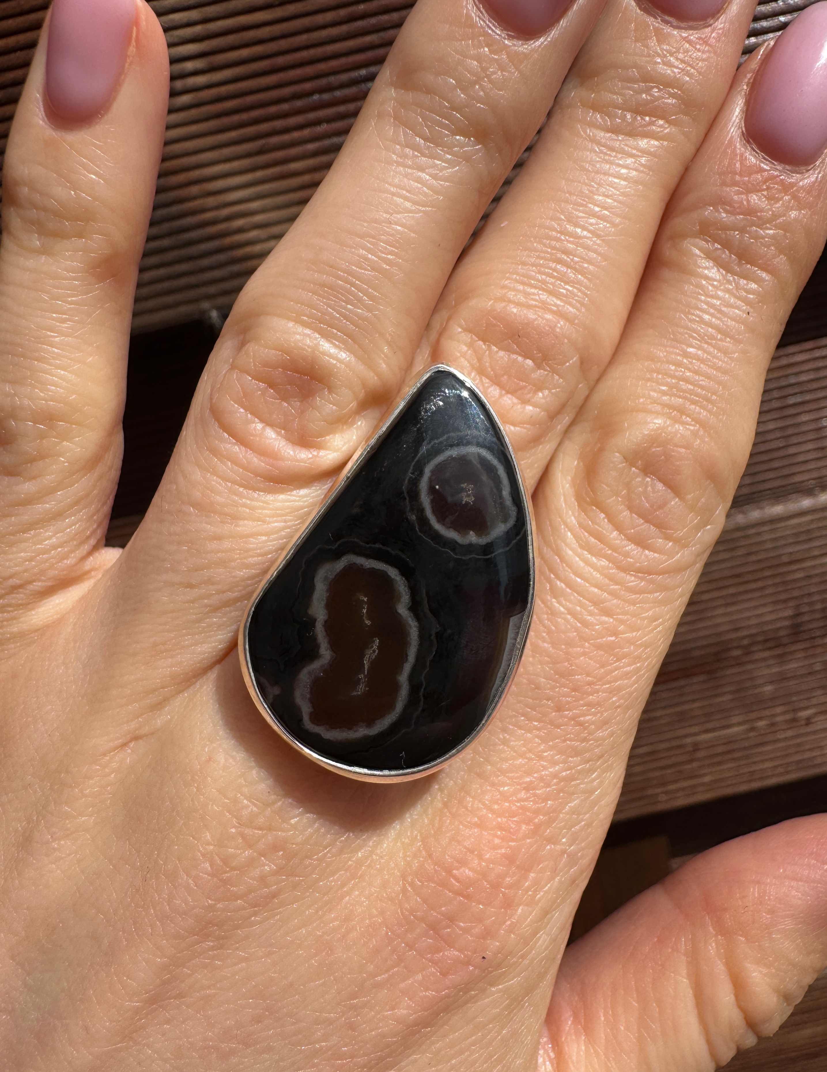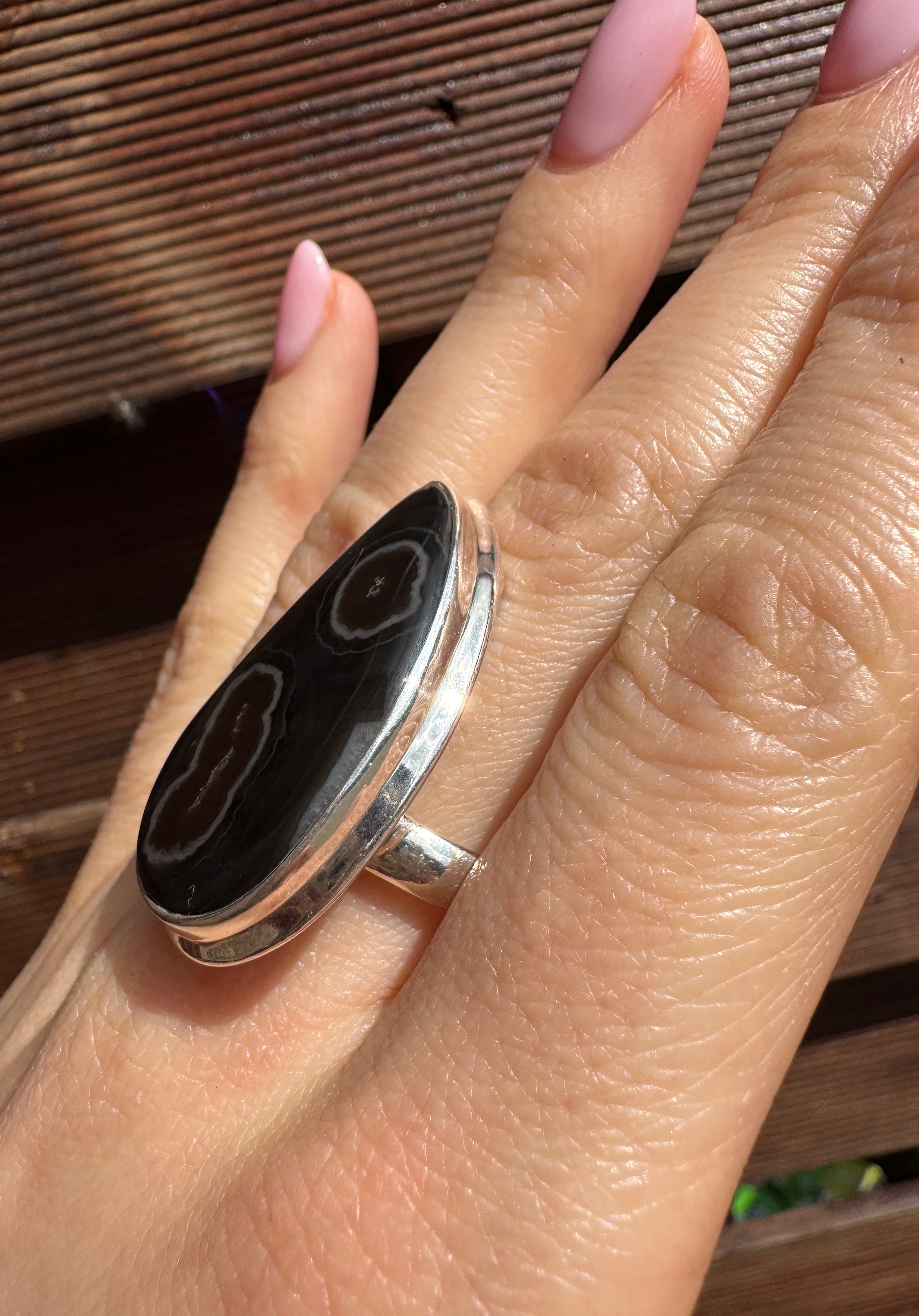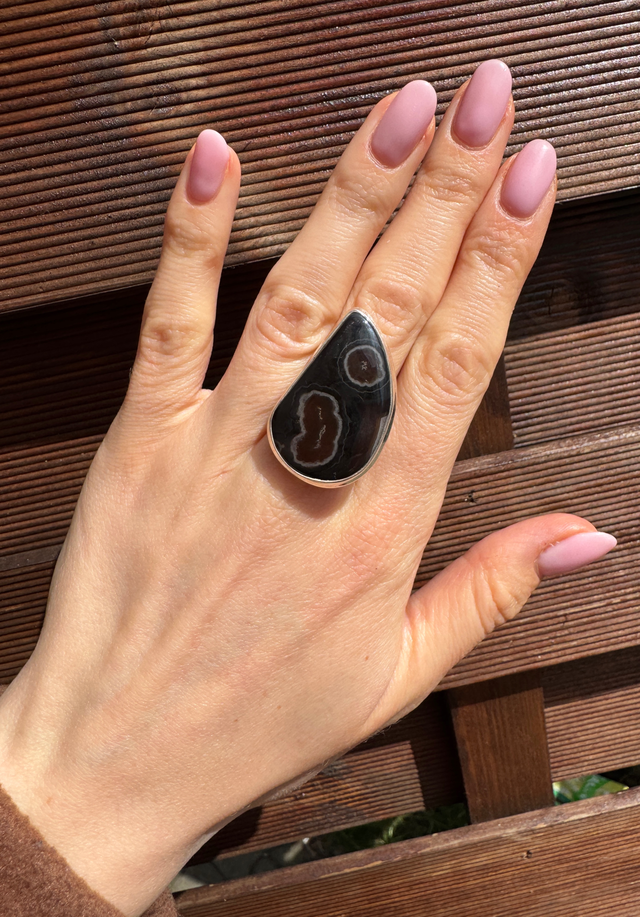 Ręcznie wykonany pierścionek z czarno-brązowego agatu i srebra pr.925