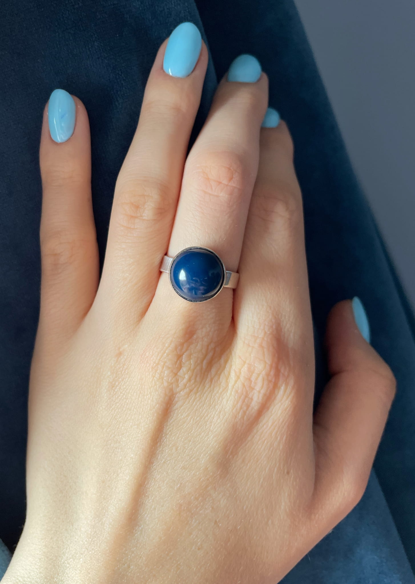 Ręcznie wykonany pierścionek z kulki agatu niebieskiego i srebra pr.925