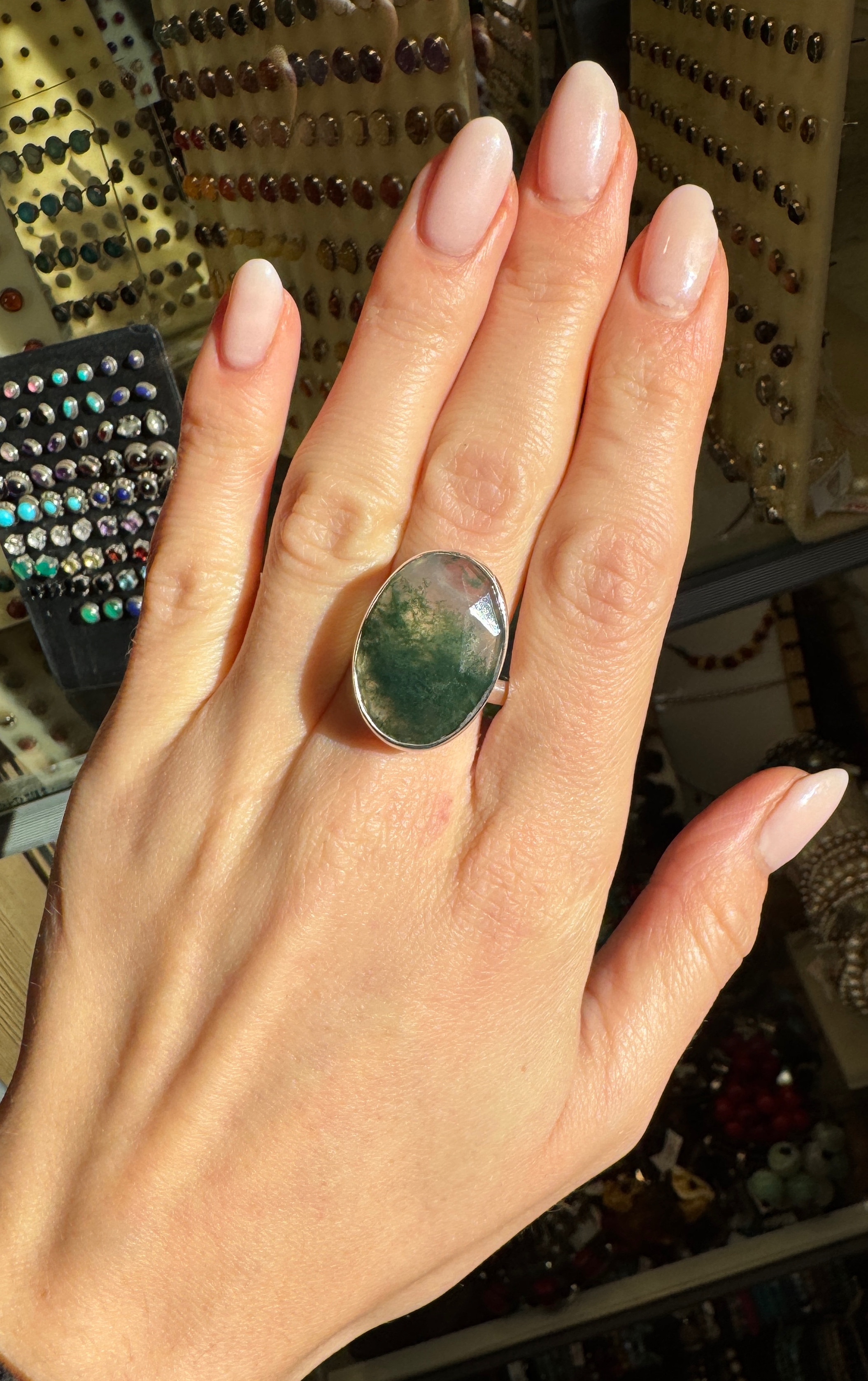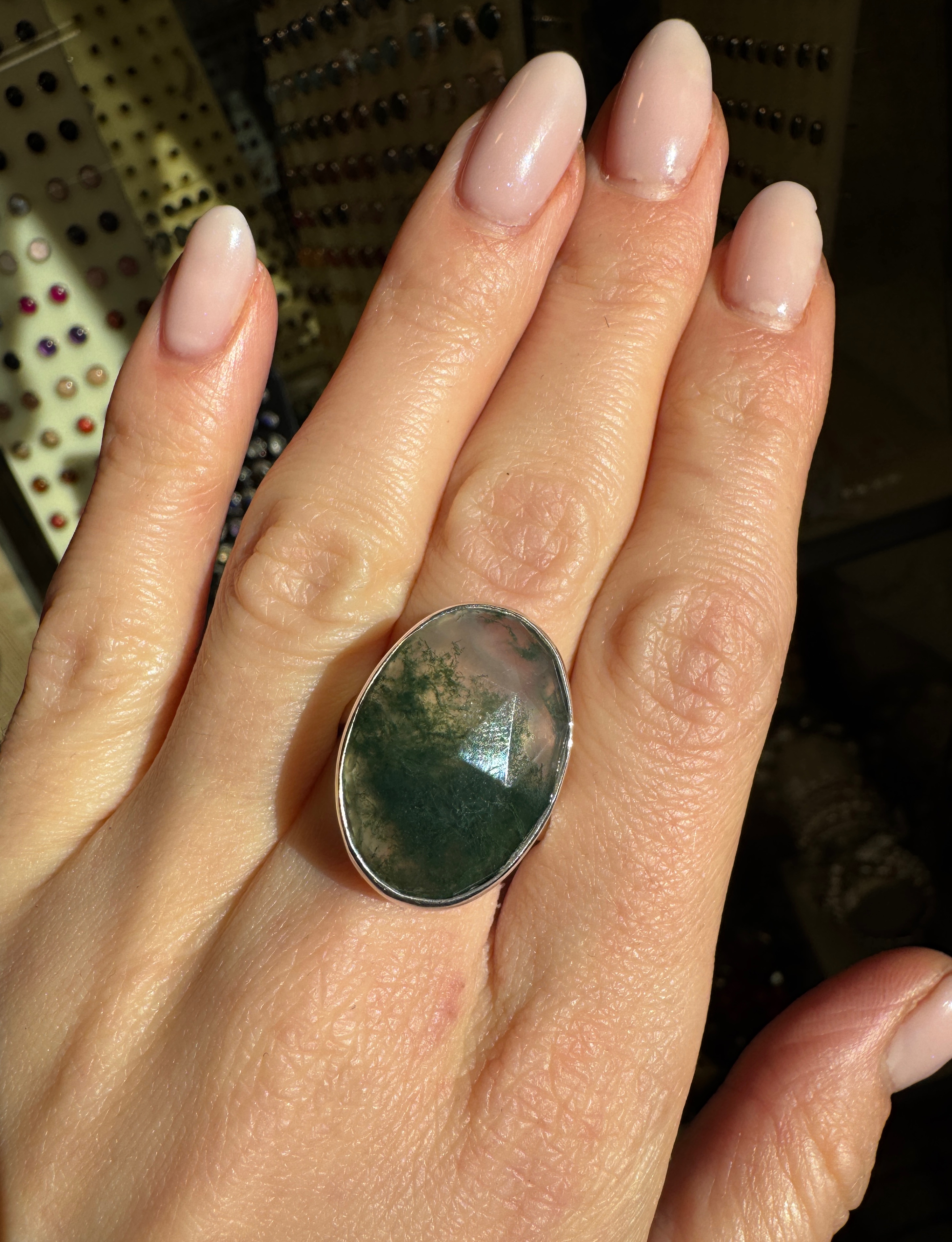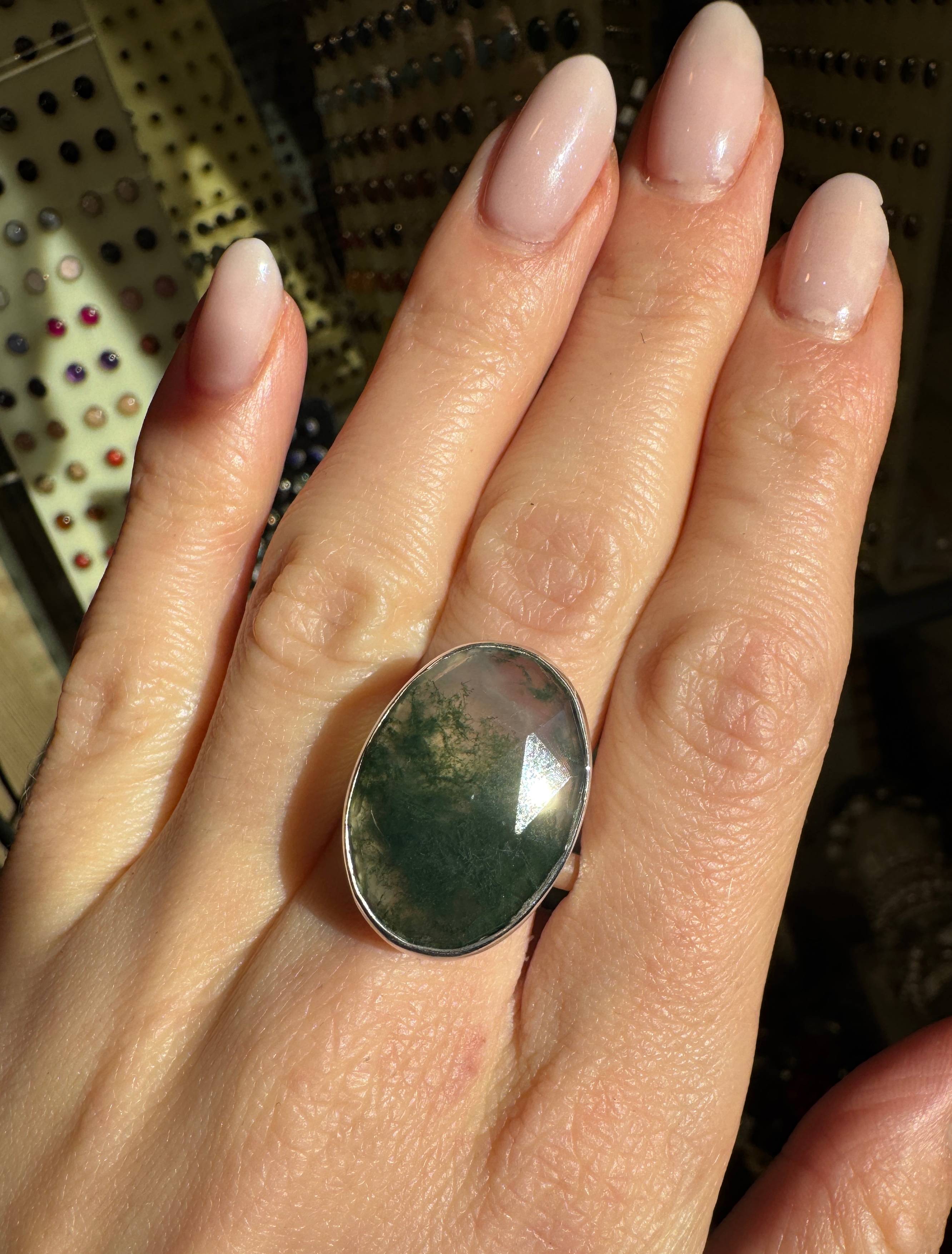 Pierścionek agat zielony mszysty owal fasetowany